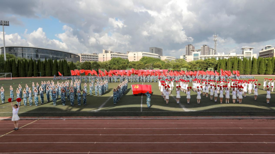 伴随着慷慨澎湃的《中国人民解放军军歌》,学员们踏着整齐的步伐,列队走向阅兵场。在“齐步走”“正步走”的口令下,整齐划一的步子砸向地面,配着响亮的连队番号,掷地有声。矫健的步伐,有力的摆臂,整齐的列队,学员们以高昂的精神面貌自信地走过阅兵场,向主席台、观礼台师生汇报14天的军训成果。主席台、观礼台人员不时鼓掌、敬礼致意,对学员们的精彩表现表示深深赞许。军旗、党旗、红旗、持枪、劈枪方阵,他们用矫健的身姿,飒爽的英姿,诠释着新时代青年学子斗志昂扬的军容风貌。他们以气吞山河的雄伟气势向着新征程的伟大目标,前进!随着最后一个方阵走过阅兵场,格斗术、战术表演及团体操依次上演,其中团体操方阵,动作整齐优美、队形变化万千,由100的字样变化成一朵花,在结尾变化出了1921-2021的字样,为中国共产党成立100周年献礼。出彩的演出赢得现场阵阵掌声。