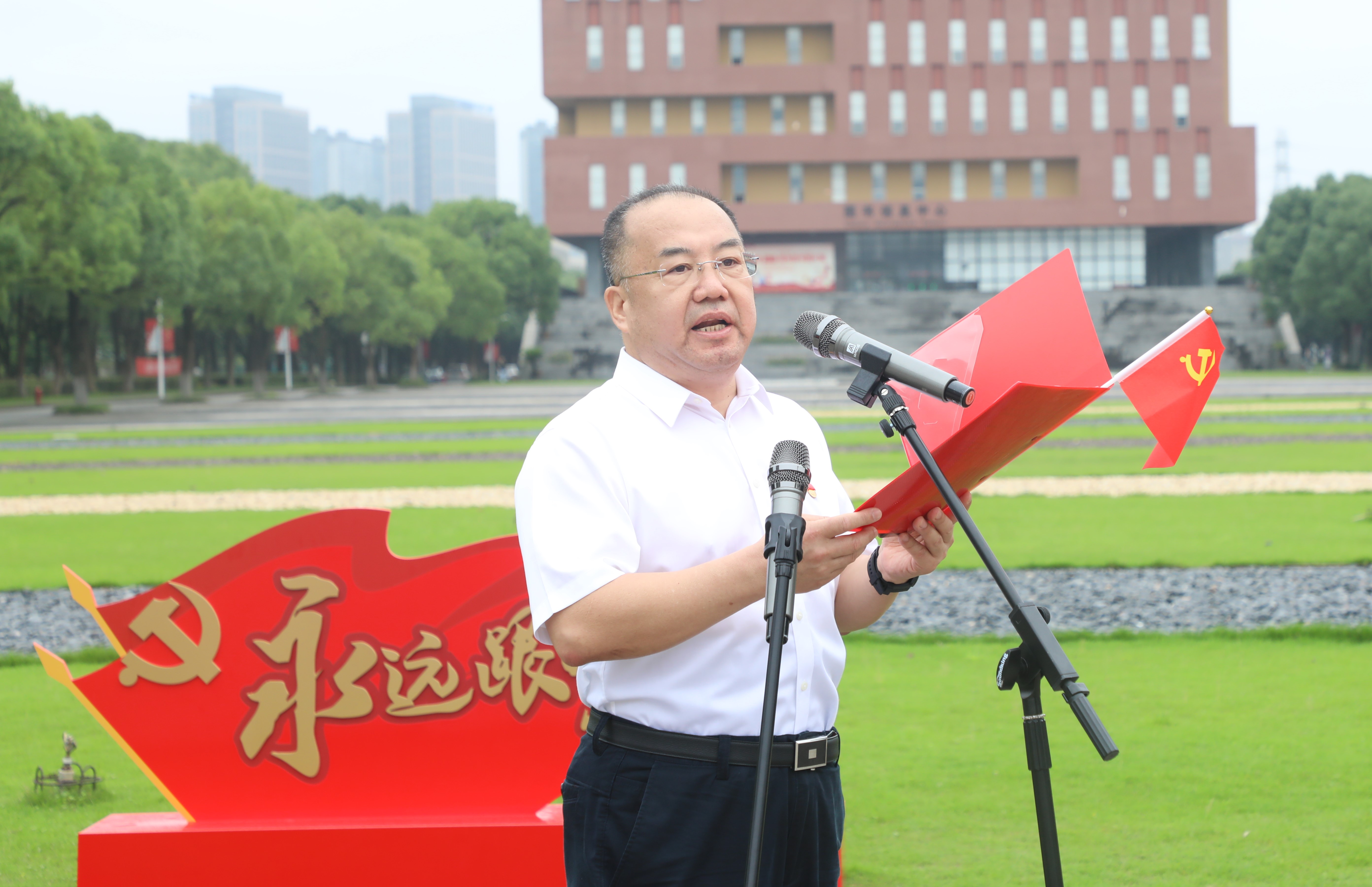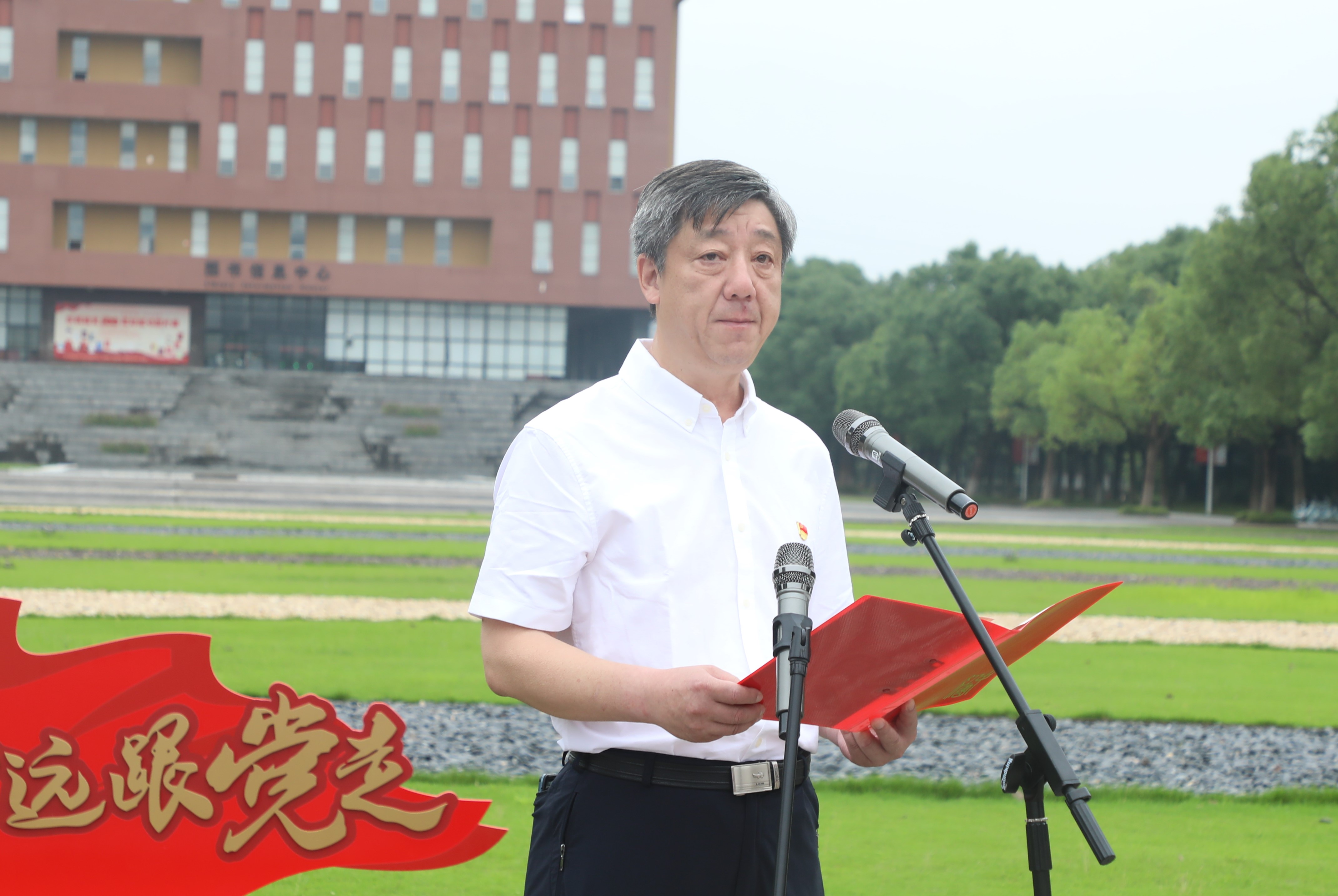 学校党委副书记李凤旺主持仪式,他在总结中讲到,中国共产党将开启新的征程。立足新时代,希望全体师生不忘初心、牢记使命,紧密团结在以习近平同志为核心的党中央周围,听党话、跟党走,传承红色基因、汲取奋斗力量,以新的精神状态和奋斗姿态把“省内一流、全国百强”建设不断推进向前。