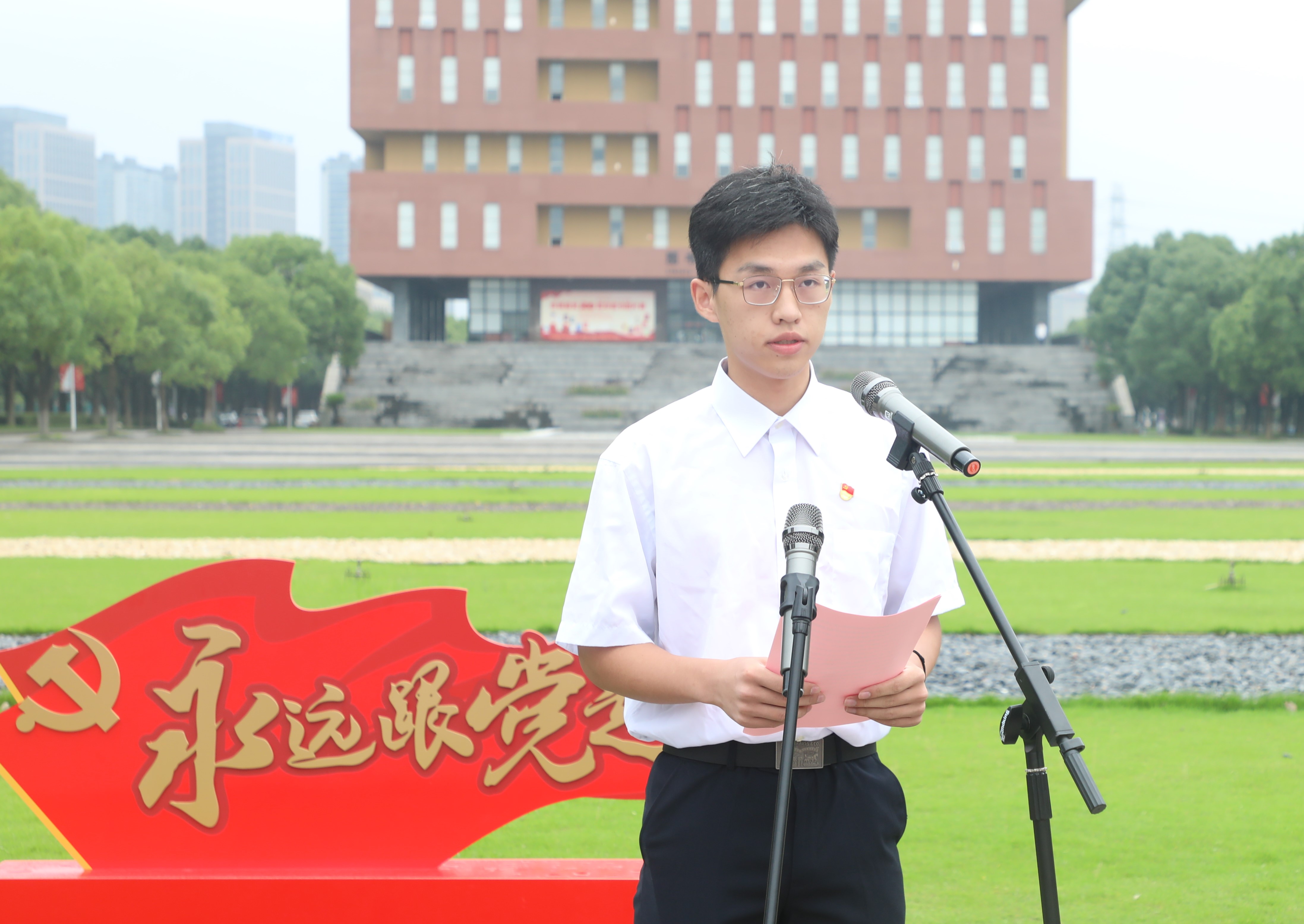 学校学生会执行主席黄浩栋作为学生代表发言。党旗所指,就是青年所向。他呼吁青年大学生坚定理性信念,追逐青春梦想;练就过硬本领,夯实专业基础;勇于解放思想,创建青春之国。