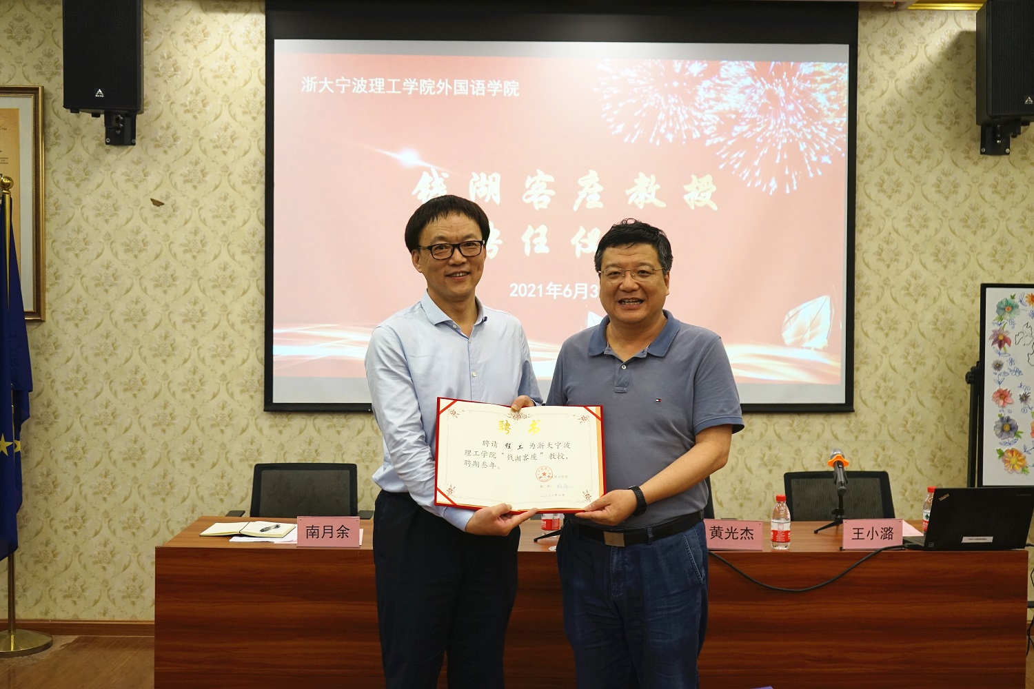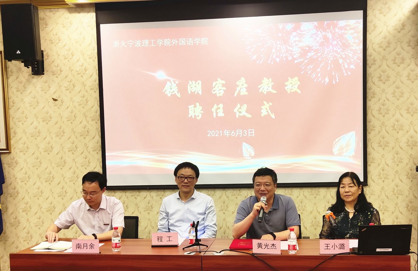 仪式上,南月余宣读聘任决定,黄光杰为程工颁发聘书并佩戴校徽。程工教授在仪式上发言,他表示多年来始终关心开云kaiyun官网外国语学院的建设与发展,作为“钱湖客座教授”,自己一定会竭尽所能、为学院高速高质量的发展贡献一份力量。
