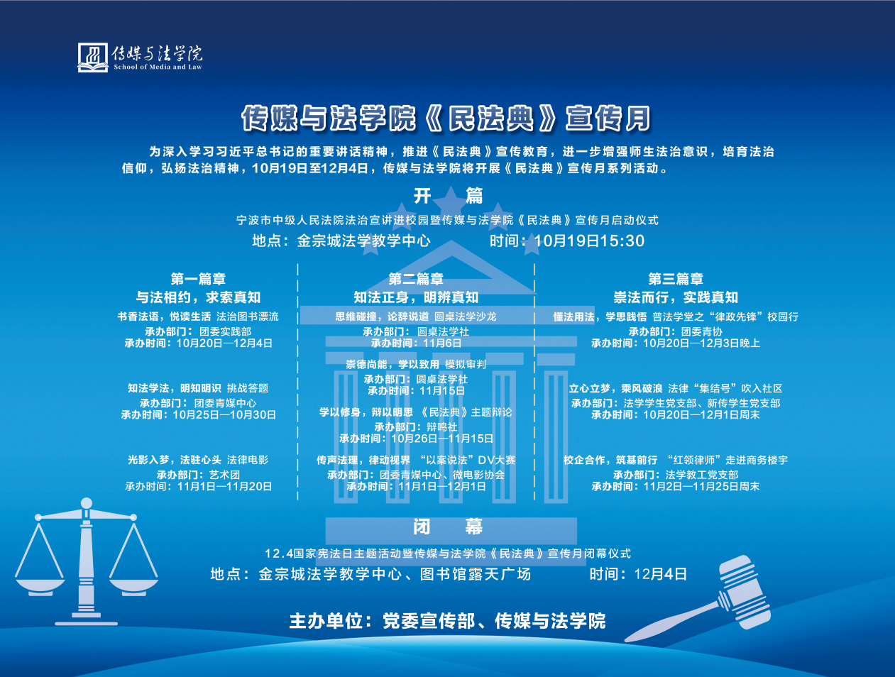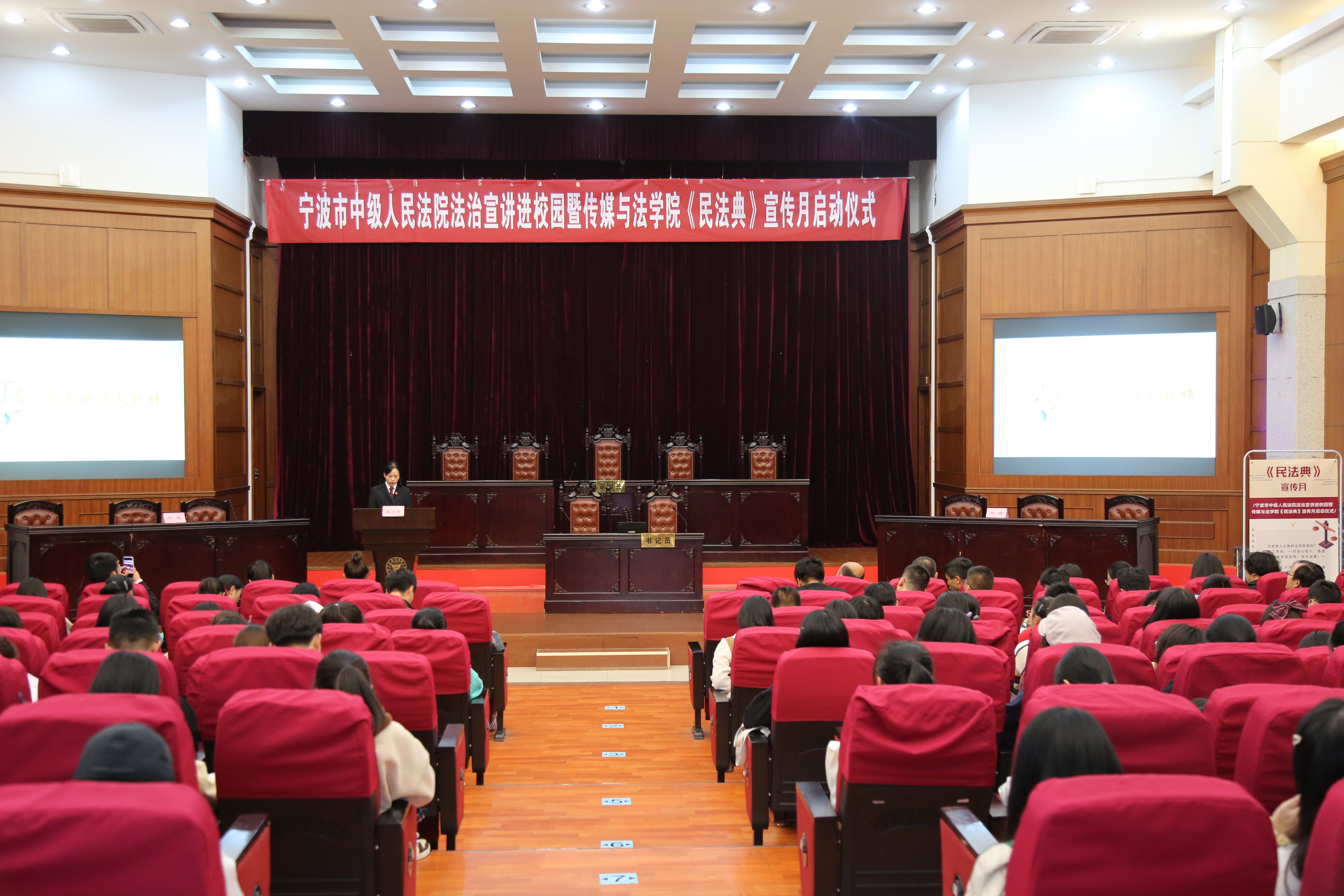 为深入学习习近平总书记的重要讲话精神,推进《民法典》宣传教育,进一步增强师生法治意识,培育法治信仰,弘扬法治精神,10月19日下午,宁波市中级人民法院法治宣讲进校园暨学校《民法典》宣传月启动仪式在开云kaiyun官网金宗城法学教学中心举行。宁波市中级人民法院清算与破产庭庭长蔡惠娜、员额法官张颖璐、法官助理常黎阳、法官助理王舒蒙受邀参加活动并进行了交流与分享。学校党委组织部、统战部部长周树红,宁波市致公党综合一支部主委黄盛林,宁波市致公党开云kaiyun官网主委江海亮,传媒与法学院相关负责人、教师,宁波市致公党综合一支部党员和宁波理工学院支部党员也到场观看。