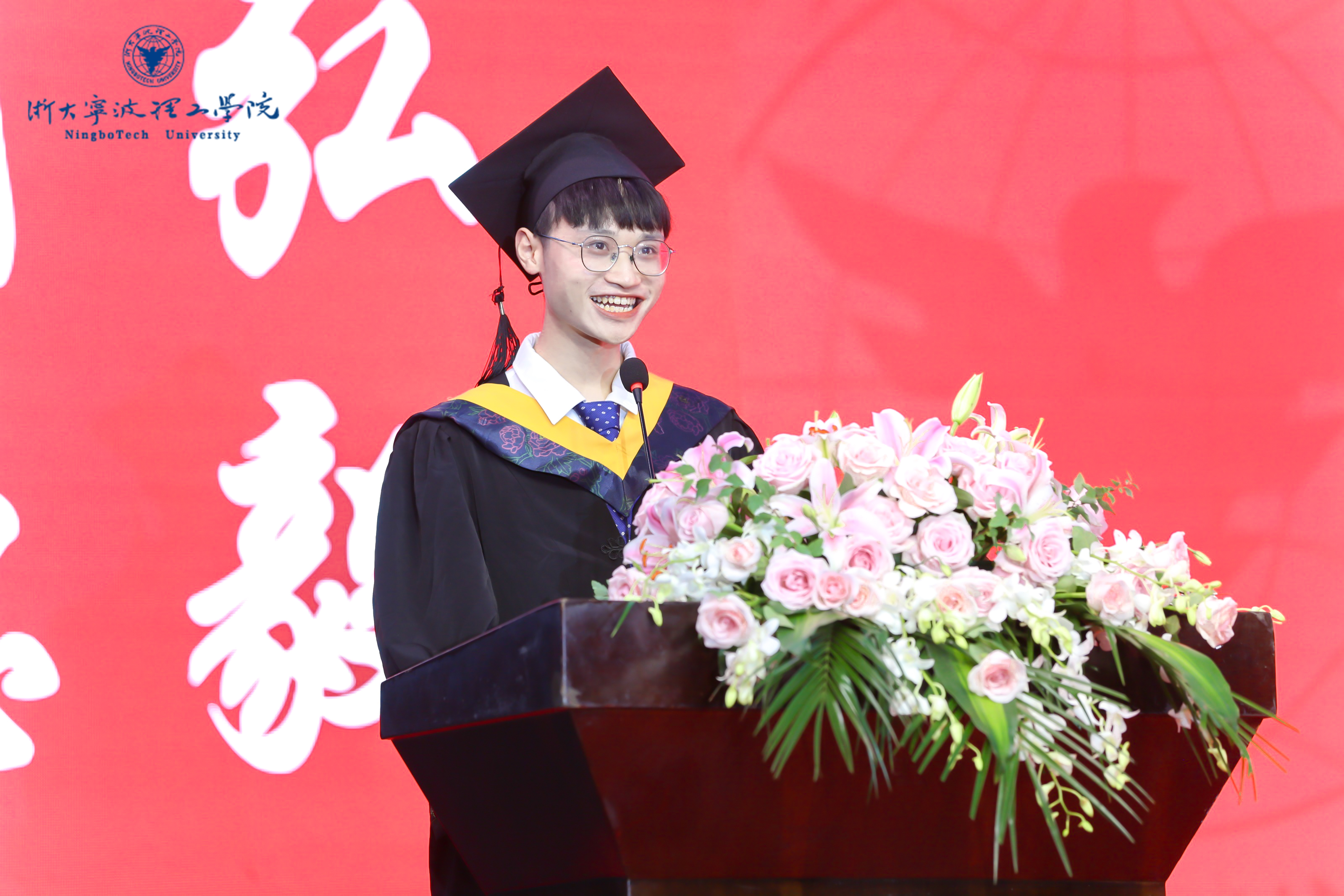 生物与化学工程学院化工161班毕业生陈嘉磊作为代表发言。回顾大学时光,记忆里的广播操、那年的冬训、一学期三十次的晨跑......点点滴滴都是难忘的珍贵时光。这段人生旅程,同学们从平凡处开始,在实干中进步,坚守自己的初心和选择,有汗水、有泪水,更有成长与蜕变。他代表同学们向母校、向恩师、向父母亲友表达深深的感恩之情,并与同学们共勉在各自的人生主场有一份力量便点一盏灯,平凡的我们必定会创造出熠熠生辉的不平凡成就。