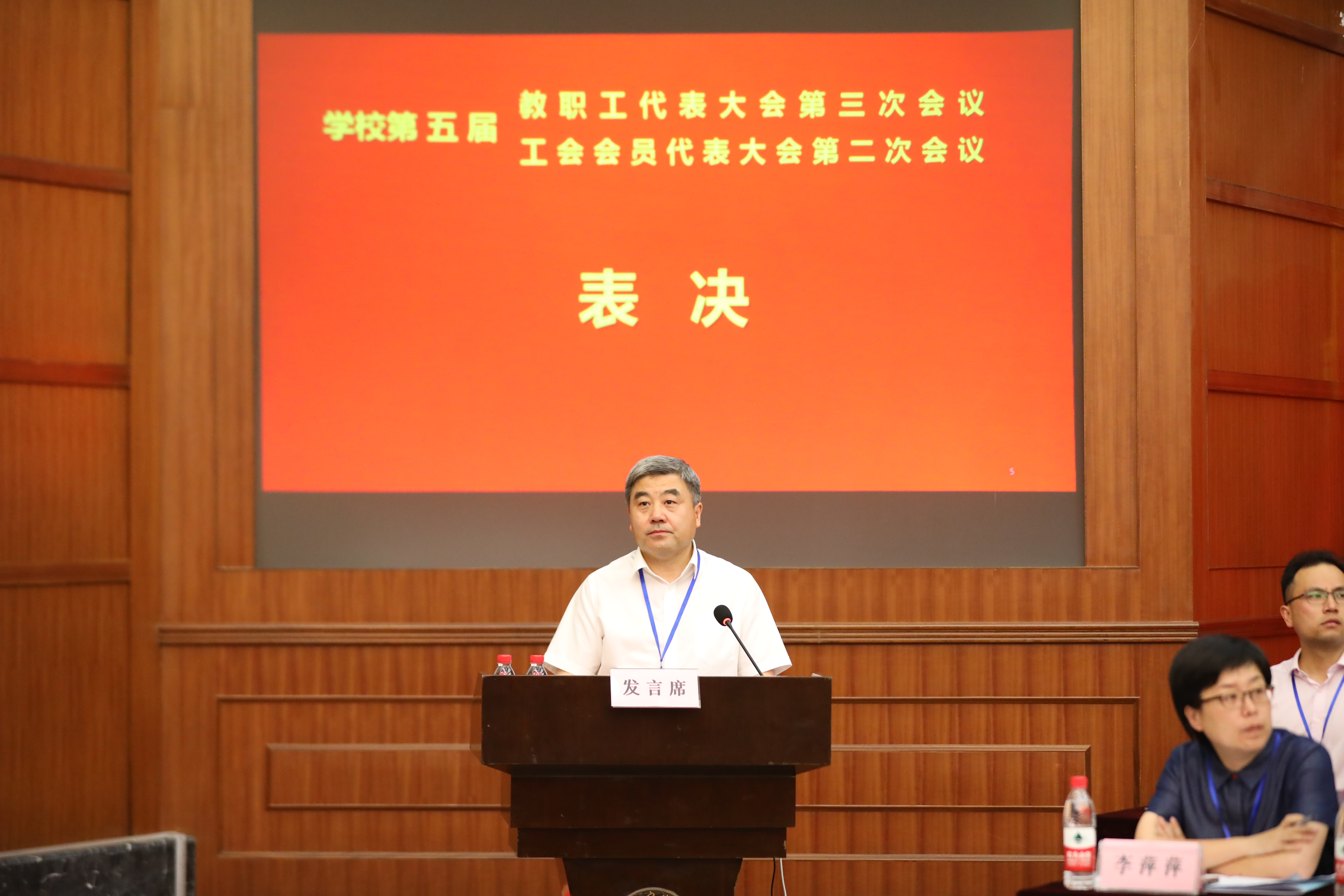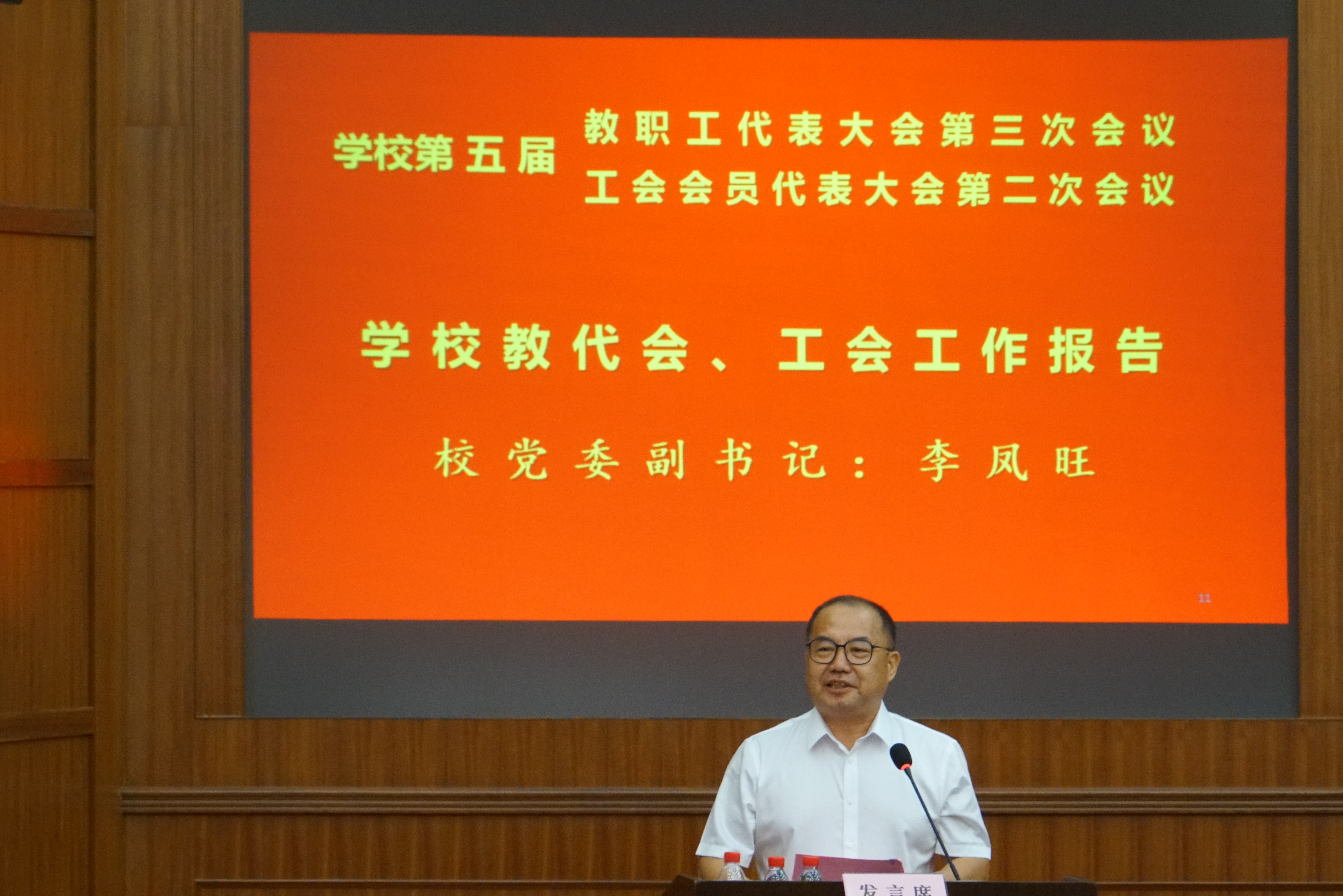 学校党委副书记、工会主席李凤旺受第五届教代会执委会、工会委员会委托向大会作报告。报告指出,在学校党委的正确领导和行政的大力支持下,教代会执委会、工会坚持以习近平新时代中国特色社会主义思想为指导,团结和动员广大教职工,紧紧围绕学校发展目标和中心工作,通过强化学习教育、深化民主管理、引导成才成长、丰富文体活动、实施精准服务、加强自身建设,积极推动学校科学发展,促进了校园和谐稳定。报告提出,2020年将围绕“活力工会”建设目标,着力强化“建设、维护、参与、教育”职能,明确了强化教育引导,发挥政治引领作用;推动工作创新,完善自身建设;推进民主管理,维护职工权益;丰富文化生活,实施健康工程;提升服务手段,增强教职工幸福感等方面的主要任务。