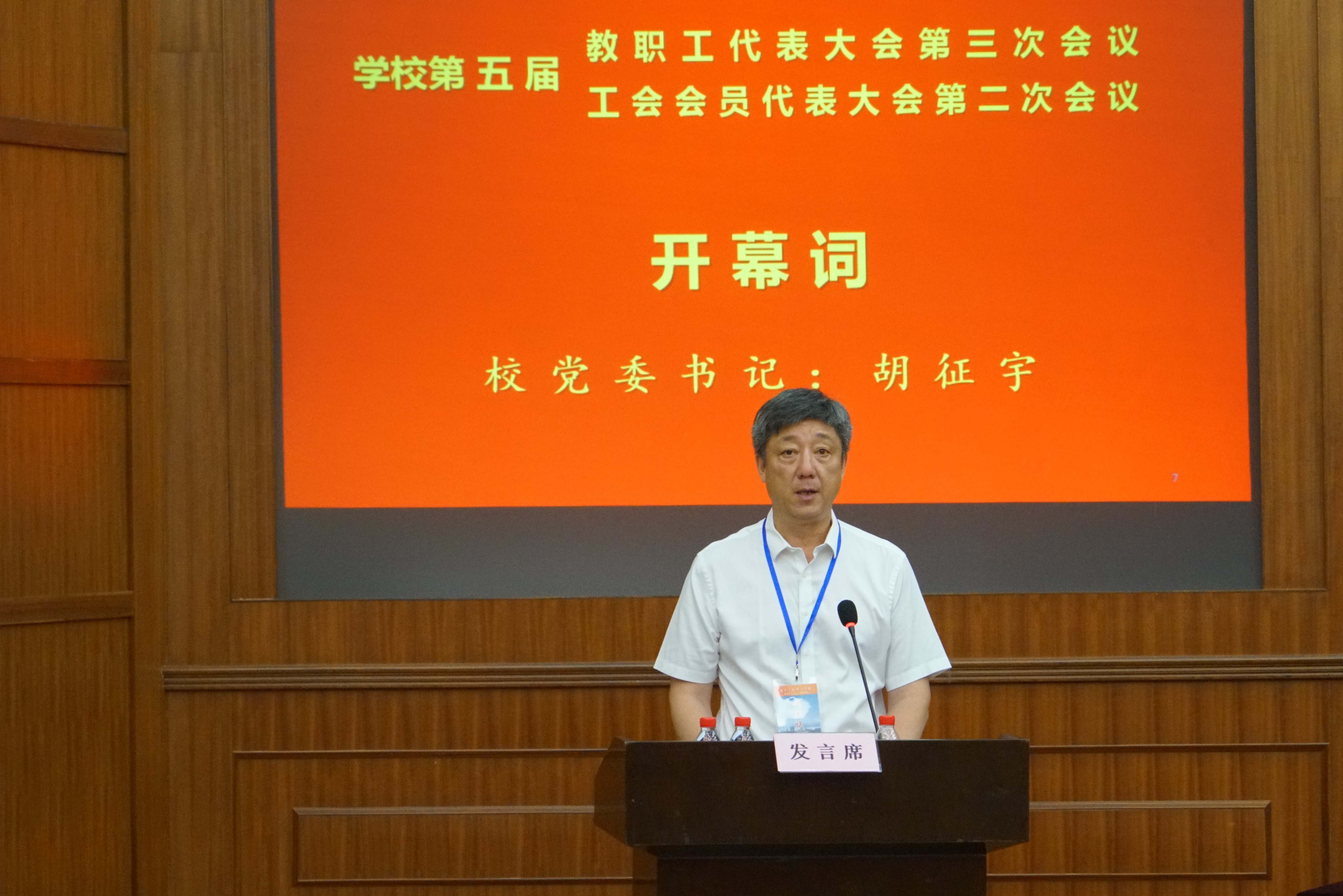 党委书记胡征宇致开幕词,代表学校党委、行政向大会召开表示祝贺,对各位代表以及广大教职员工坚守岗位、辛勤付出表示感谢。他指出,当前学校正面临转制开新局、体制变革的过渡期,需要大家深刻认识到学校性质改变所带来的一系列从理念到行动的变革,广聚智慧、共谋发展,积极面对一场由内而外、由上而下、切入机理的深层次重大改革。他回顾了学校19年的办学历程、发展成果,正是一种求是图强、求实图兴、求新图进的理工精神,激励着一批批理工人接续奋斗,不断创造学校新的更优业绩。凡是过往,皆为序章,站在新的发展起点上,胡征宇勉励各位代表要不忘初心、凝聚共识,坚持建校初心,把思想高度统一到学校的意志和决策上来,营造“上下同欲者胜”的奋进局面;要不负重托、履职尽责,提出真知灼见,多做团结鼓劲工作,发挥好代表的纽带作用;要求学校教代会执委会和工会不惧挑战、深化改革,根据新形势新要求,通过真心、真情服务,把广大教职工和工会会员团结凝聚在学校党委行政周围,以高要求、高水准、高质量,把学校建设成为转制发展的排头兵、模范生。