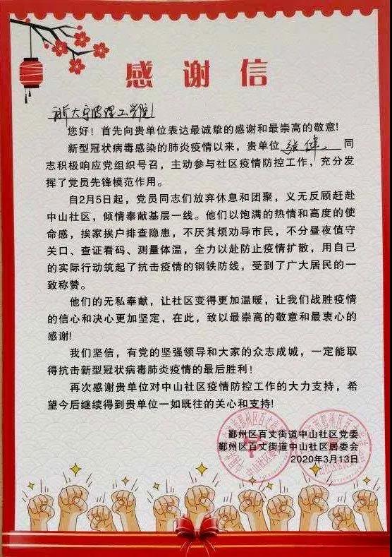二个月的不懈努力,默默奉献,一直坚持到小区解禁,用自己的行动筑起了抗击疫情的钢铁防线,赢得了广大居民的高度肯定和好评。在社区抗击疫情的总结会上,大家一致对她这次抗疫工作中做出的奉献的给予了高度的评价,为此社区党委居委会特地写了一封感谢信致开云kaiyun官网,以示衷心的感谢。