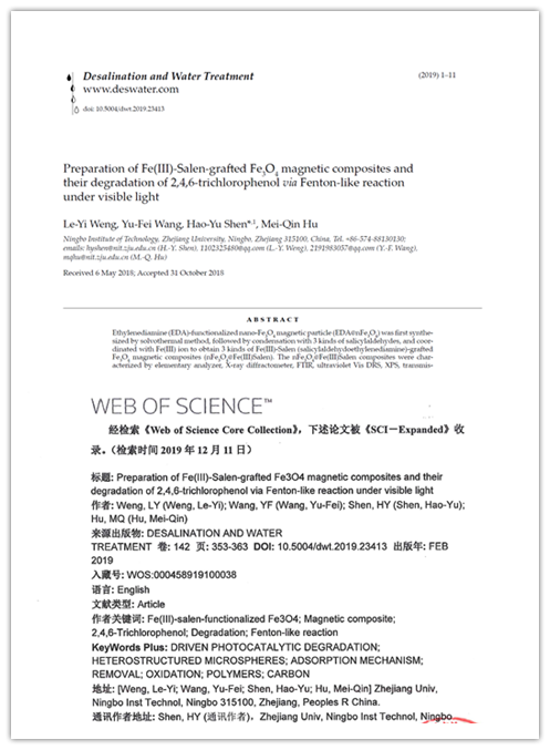 以化学工程与工艺专业2015级本科生翁乐仪为第一作者,学校教师沈昊宇教授为通讯作者的SCI论文“Preparation of Fe(III)-Salen-grafted Fe3O4 magnetic composites and their degradation of 2,4,6-trichlorophenol via Fenton-like reaction under visible light”发表在环境科学与生态学领域期刊Desalination and Water Treatment。
