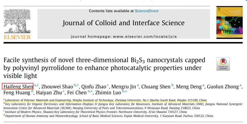 近日,学校高分子材料与工程专业16级本科生沈海峰以第一作者发表JCR一区(JCR一区指该学科所有期刊上一年度影响因子排列前25%的期刊)研究论文。他在胶体与界面科学领域顶级期刊Journal of Colloid and Interface Science(影响因子6.361)上以第一作者发表了题为“Facile synthesis of novel three-dimensional Bi2S3 nanocrystals capped by polyvinyl pyrrolidone to enhance photocatalytic properties under visible light”的研究论文,论文的通讯作者为学校教师陈飞副教授,共同作者包括高分子材料与工程专业17级本科生金梦如同学、邓萌副教授和钟国伦教授。