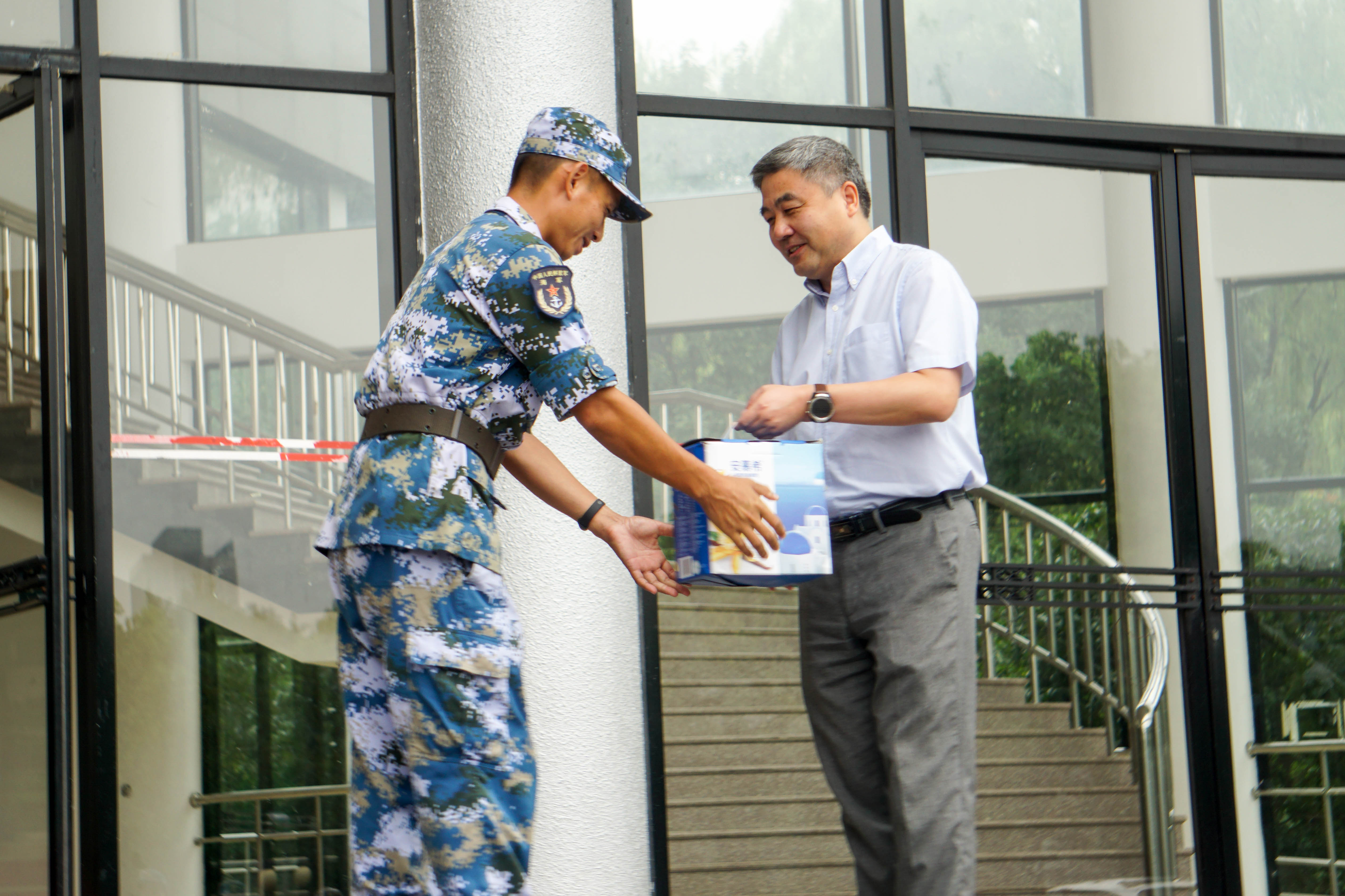 在图书馆东侧,慰问团看望了十四连、十六连以及十七连的参训学员。学员们在教官的组织下,迅速变换队形,有序排列。学员们展现出来的认真的训练态度和饱满的精神面貌获得了章献民院长的高度赞许。走到十六连队伍前,章献民院长拿起话筒,给学员们讲述了武警兵官送别战友的故事,希望大家能够珍惜军训时光,珍重军训中同甘共苦的战友情谊。他叮嘱学员们注意身体,通过军训锻炼自己的身体素质和意志品质,同时努力克服困难,希望大家在军训结束后能有宝贵的回忆。