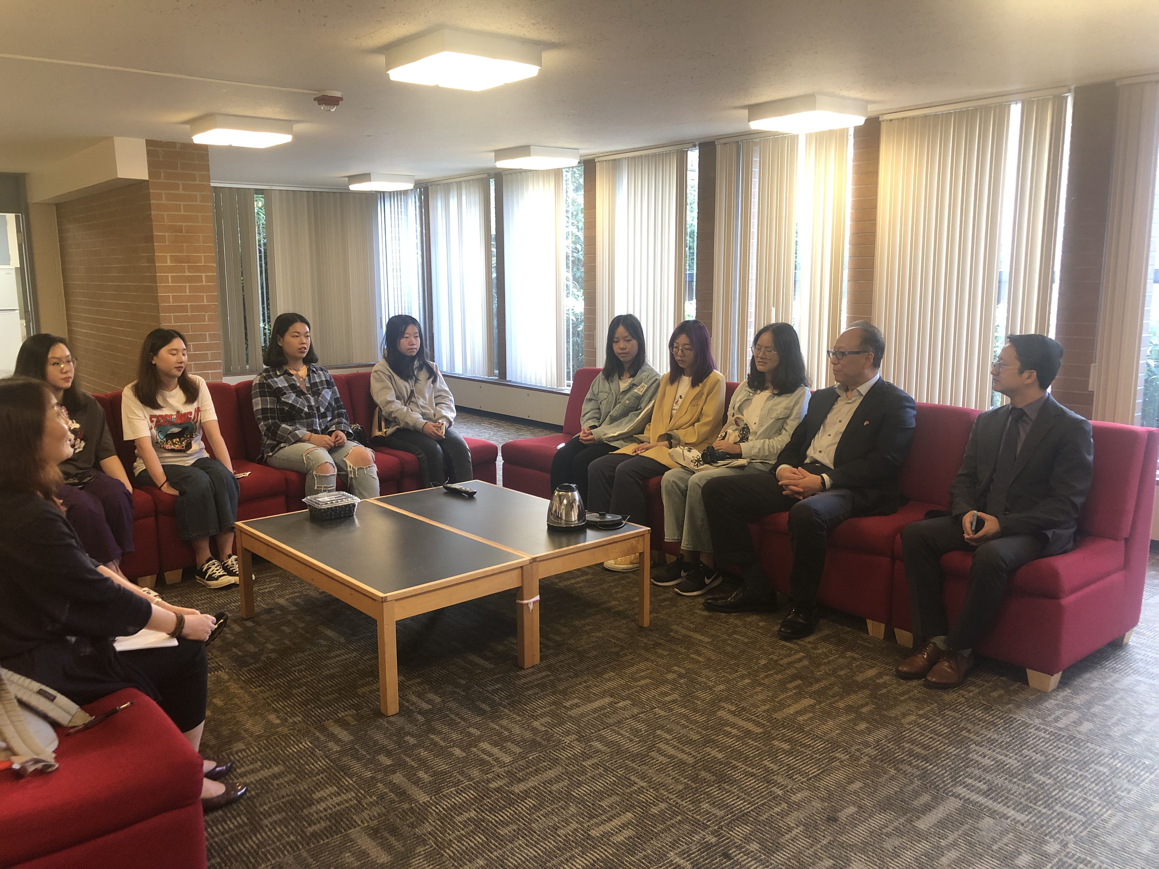 当天晚上,中国驻温哥华总领馆代总领事孔玮玮先生来到学生公寓看望学生,并对学生寄予厚望。孔先生首先对学生团的到来表示热烈的欢迎。随后,他简要介绍了温哥华的概况和英属哥伦比亚大学的历史,高度赞誉了移民到温哥华的华人曾经为建设不列颠哥伦比亚省和修建横贯加拿大东西的太平洋铁路所做的重要贡献,学生们听到这里,作为中国人的自豪感油然而生。