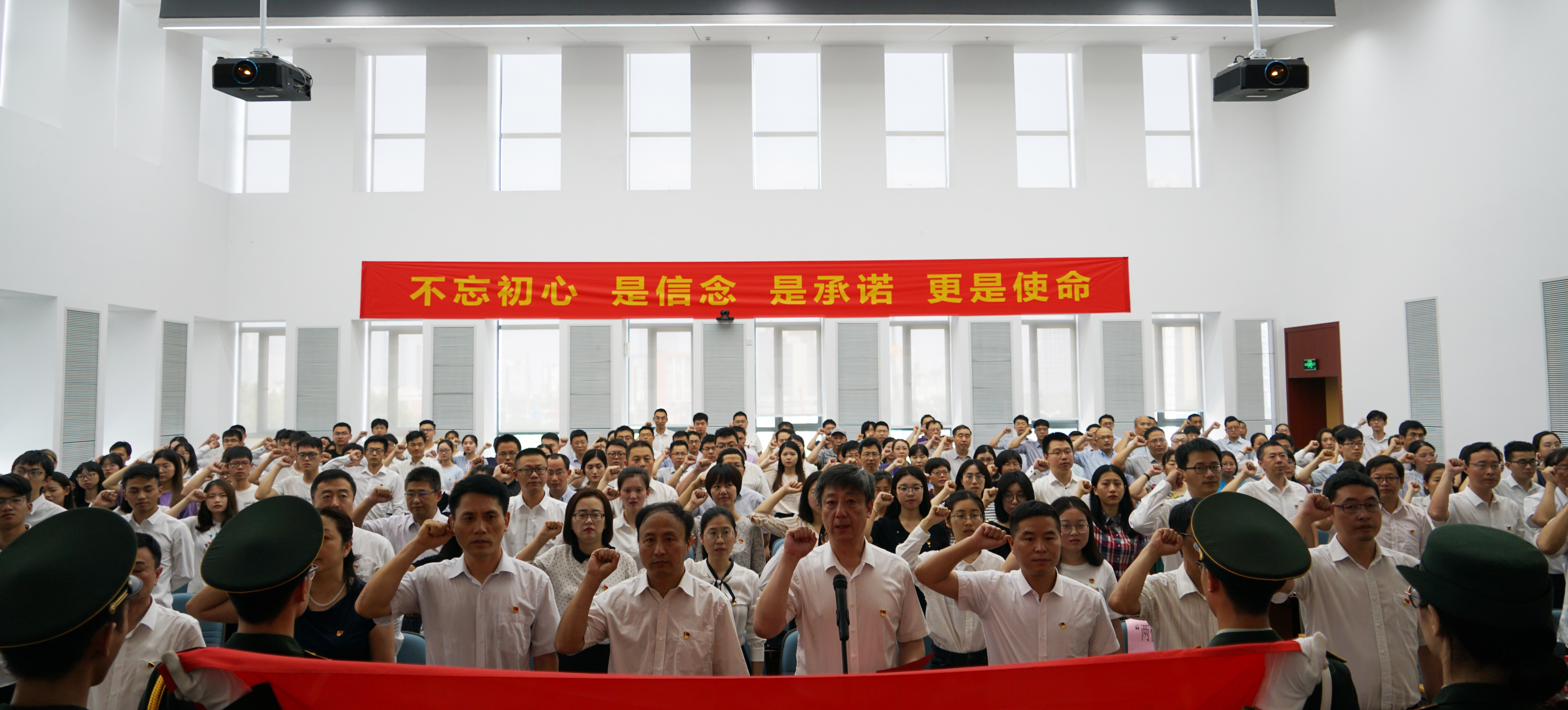 胡征宇带领新党员代表进行入党宣誓,其他党员一起重温入党誓词。