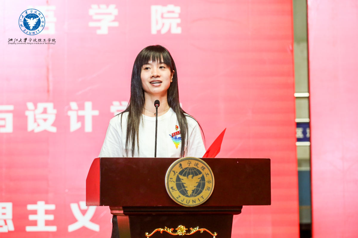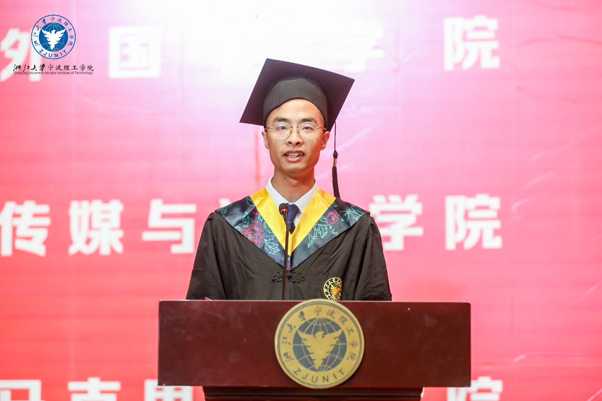土建学院道路桥梁与渡河工程151班毕业生俞俊杰作为代表发言。军训用餐前的振天口号、可珍舞台上离歌湿润眼眶、宿舍楼里叔叔阿姨的叮咛嘱咐……,这些大学生活的点点滴滴,是同学们的集体记忆。他讲到,“我们用了四五年的时光,刚刚回答完竺可桢老校长‘来浙大做什么’的大学试题;紧接着,又要提笔书写‘毕业后做什么样的人’的人生考卷。”并与同学们共勉“从这一刻开始,我们对人生梦想的实践,会更多地关乎家庭、关乎社会、关乎祖国!青春太短,梦想很大,我们唯有只争朝夕,才能不负光阴。”