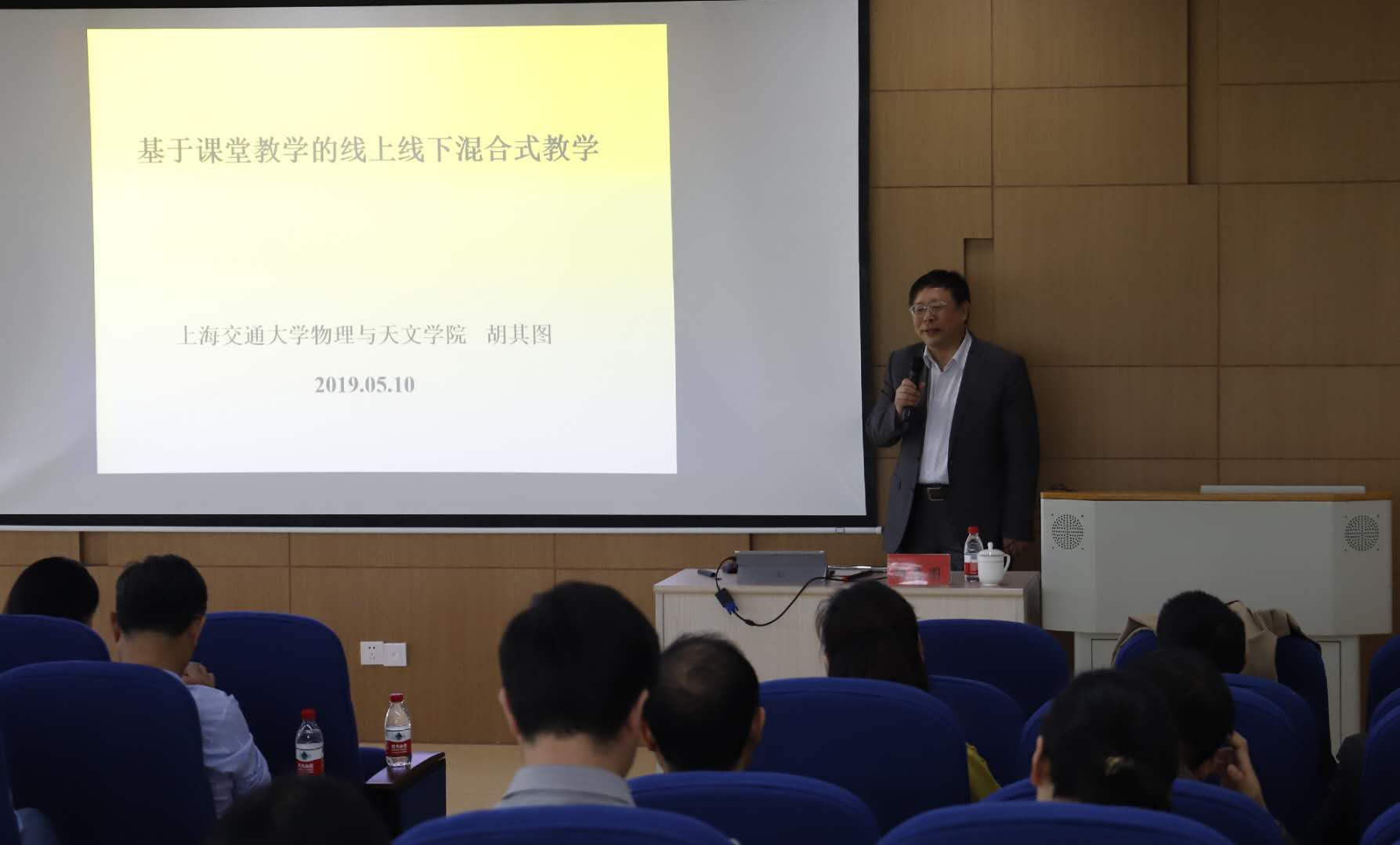 5月10日上午,上海交通大学胡其图教授做客“名师有约”,为现场教师作题为《基于课堂教学的线上线下混合式教学》的报告。活动由教师发展中心副主任陈洁云主持,来自各学院的近百位教师到场聆听。