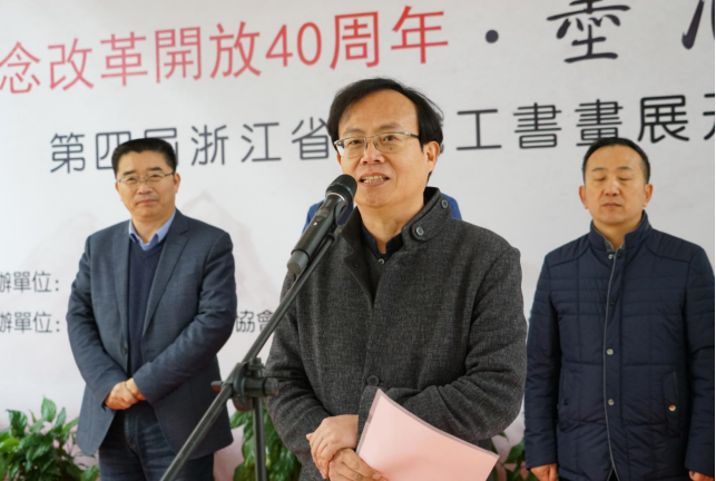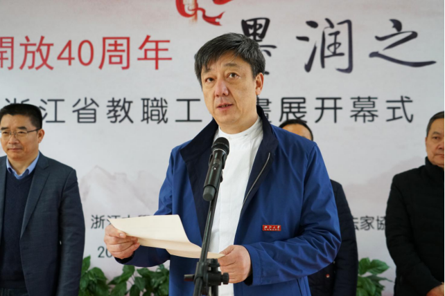 赵祖地代表省教育工会对本次书画展的顺利开展表示热烈的祝贺、向积极参与本次展览的全省高校、中小学老师表示衷心的感谢、向为本次展览给予大力支持的宁波市教育工会、浙江大学宁波理工学院及为此付出辛苦劳动的工作人员表示衷心的感谢。
