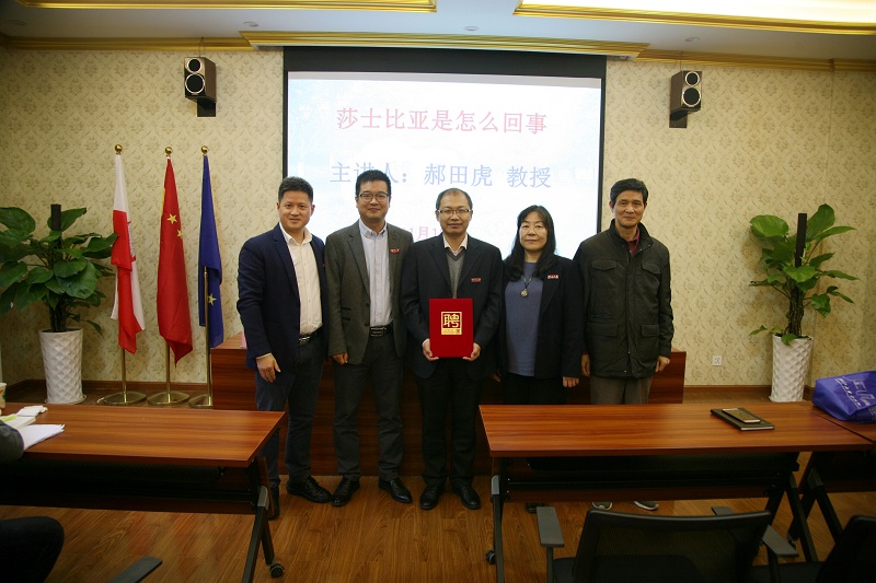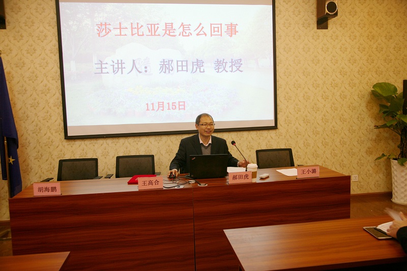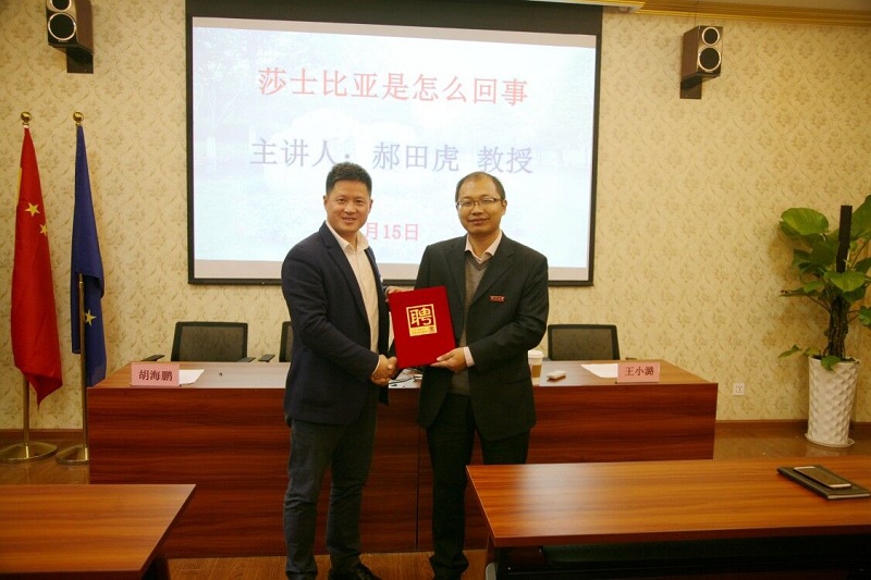 11月15日下午,浙江大学郝田虎教授应邀为外国语学院师生作《莎士比亚是怎么回事》学术报告并受聘担任学校兼职教授。聘任仪式由外国语学院副院长胡海鹏副教授主持,学校人事处王高合处长、学院王小潞院长、谌晓煜书记、蔡亮副院长出席仪式。