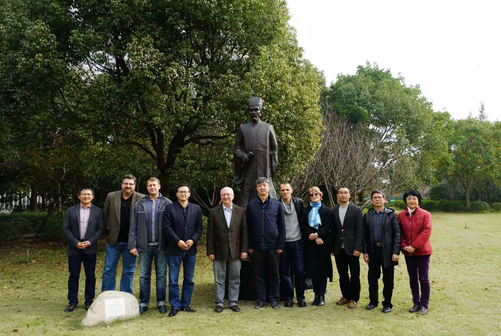 座谈交流后,胡征宇代表校区向艾朗诺教授赠送了具有中国文化元素和G20特征的扇子和丝绸,陈雪军教授向艾朗诺教授赠送了自己的书法作品“知止”,余志伟副教授和艾朗诺教授还即兴进行了中国书法创作。最后与会人员在随园王阳明雕像前合影留念。