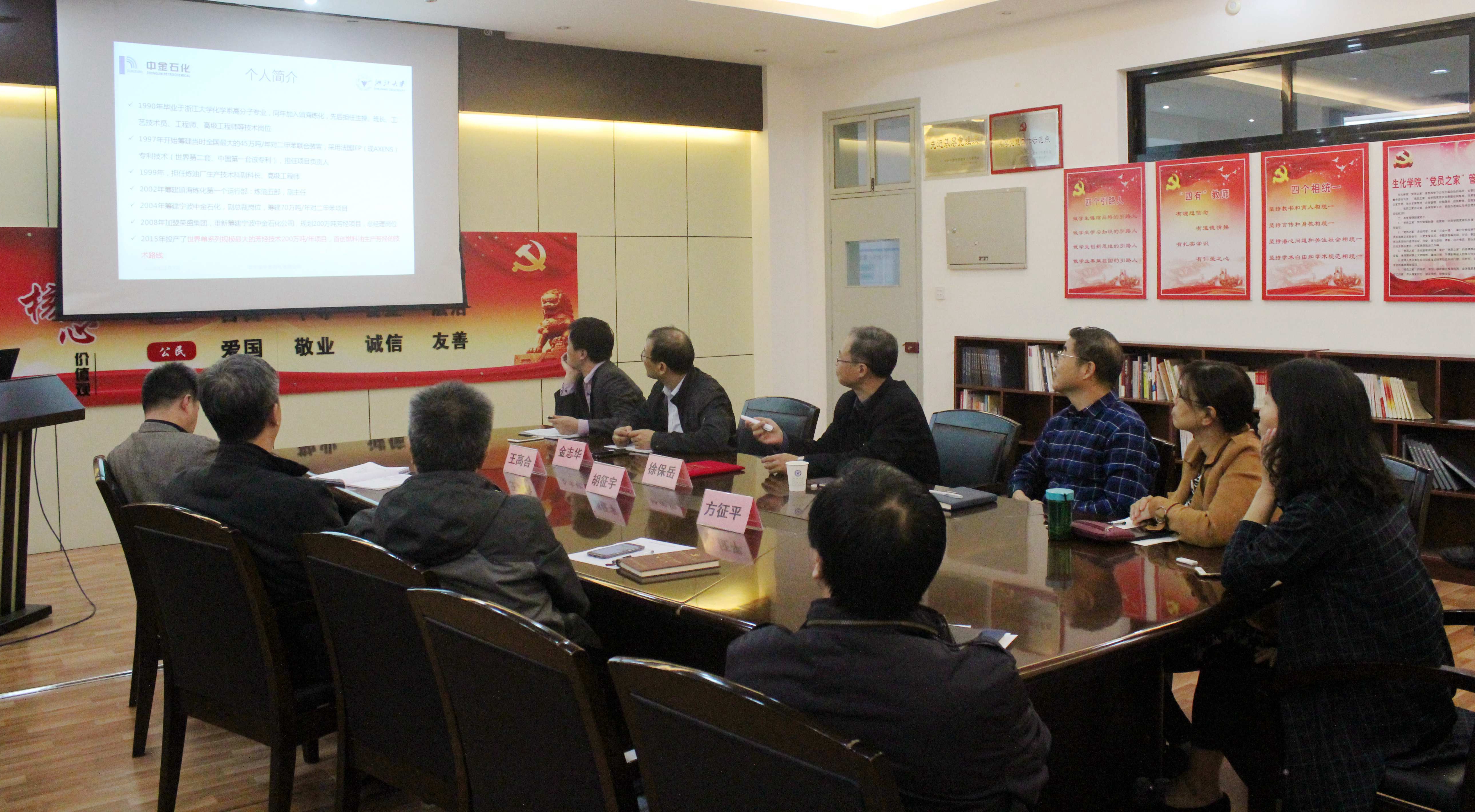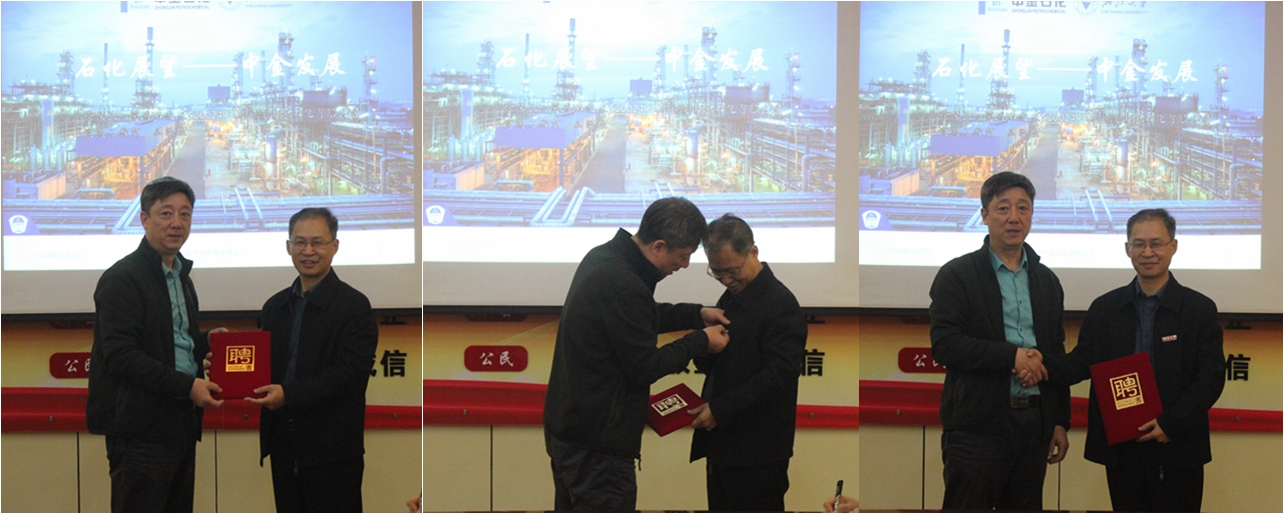 在王高合处长对徐保岳总经理作了介绍后,胡征宇书记对徐总经理的加盟表示了热烈欢迎,并为其颁发聘任证书、佩戴校徽。随后徐保岳总经理为大家作了题为“石化行业,中金发展”的主题讲座,他详细介绍了宁波中金石化有限公司的发展历程、中国石化行业现状及发展规划、企业如何适应行业发展等内容,还结合个人经历与大家分享了多年以来的宝贵管理经验。