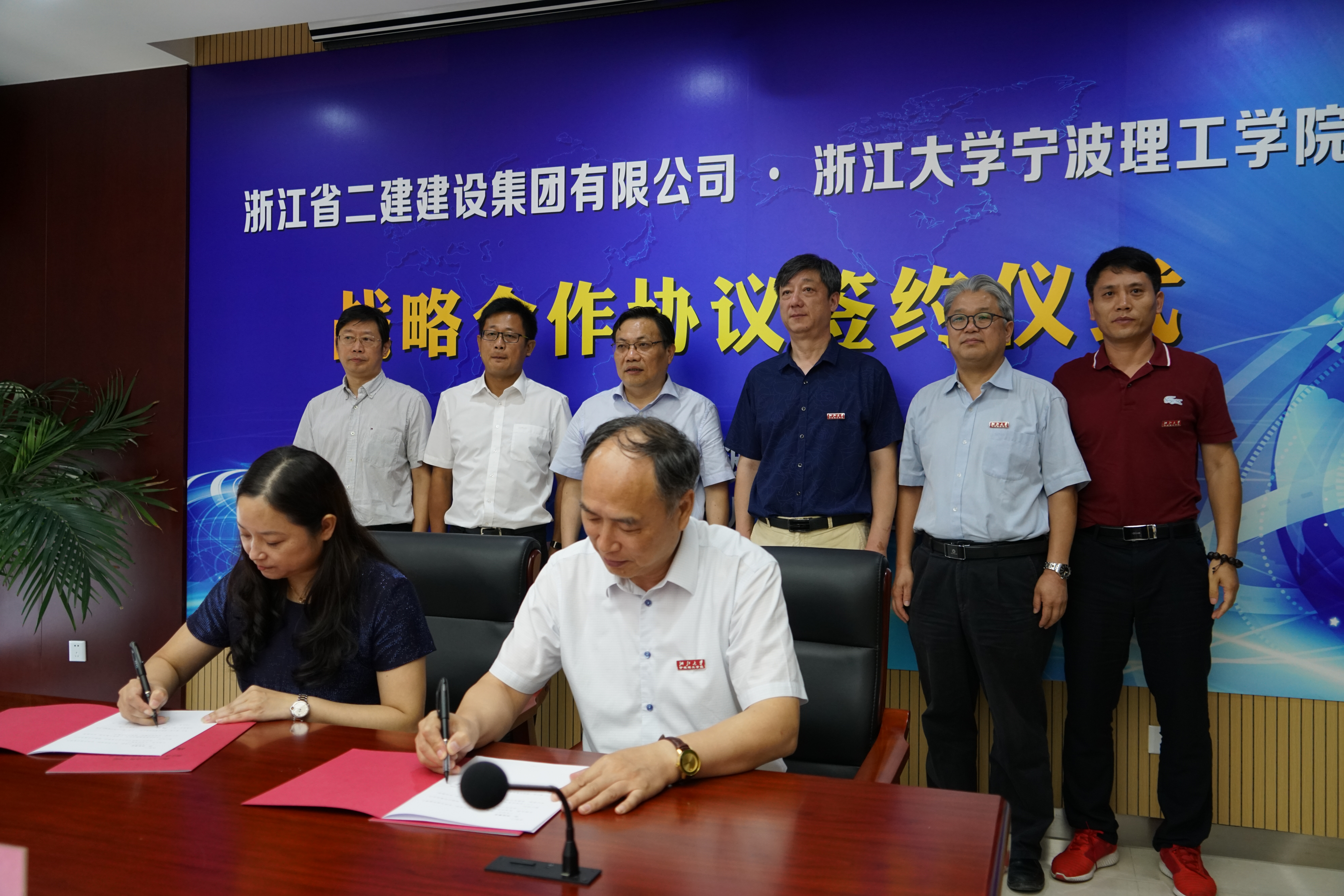 7月29日上午,浙江大学宁波理工学院与浙江省二建建设集团有限公司举行战略合作协议签约仪式。浙建集团党委书记、董事长沈德法,浙江大学校长助理、宁波市政府副秘书长、浙江大学宁波校区筹委会执行主任胡征宇见证签约并分别致辞。党委书记费英勤与二建集团党委书记、董事长陈海燕代表双方介绍情况并签署协议。副院长梅乐和、二建集团党委副书记陈春雷共同为教学实习实践基地揭牌。二建集团总经理丁民坚主持签约仪式。