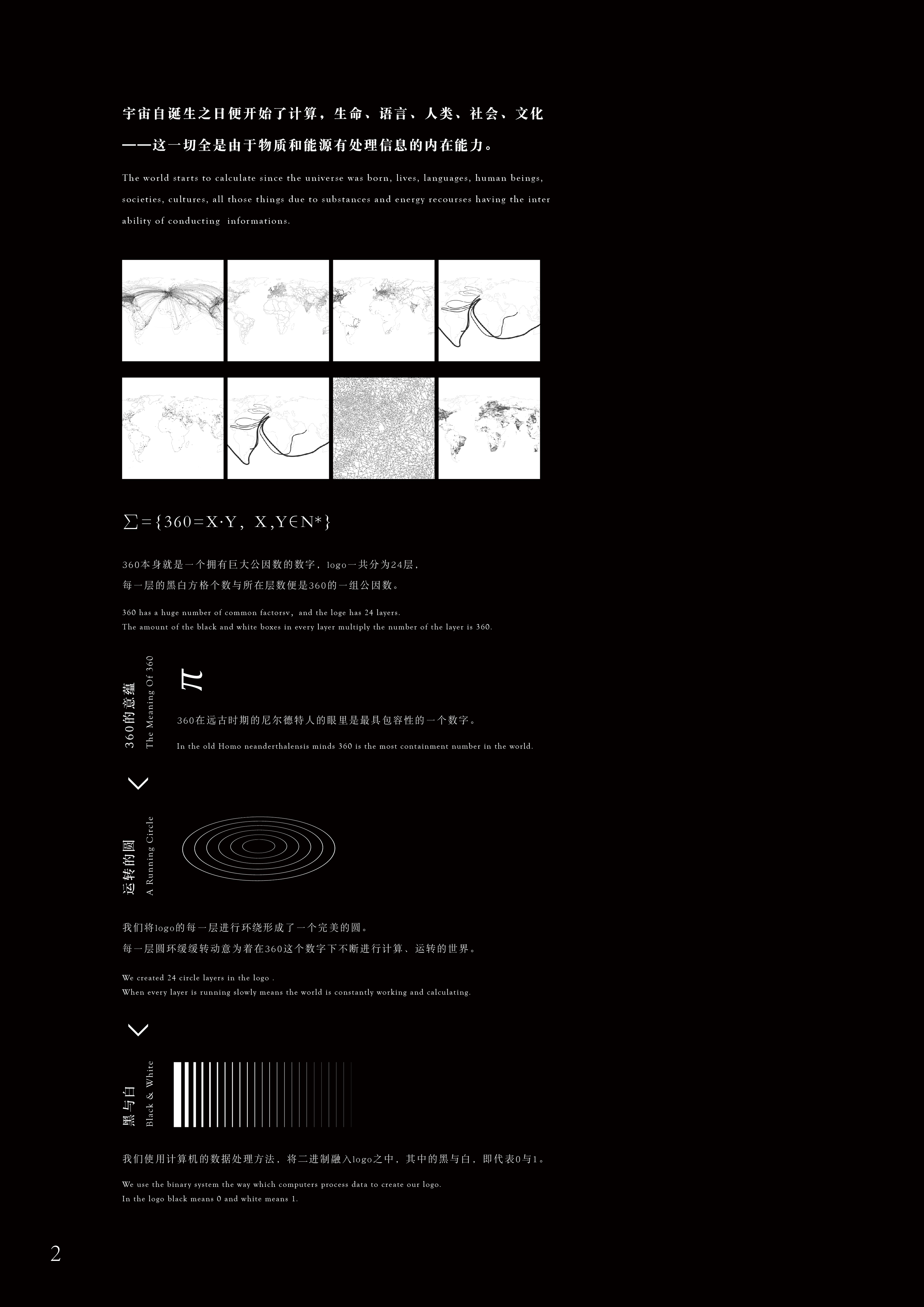 设计概念:宇宙自诞生之日便开始了计算。生命、语言、人类、社会、文化——这一切全是由于物质和能源有处理信息的内在能力。360本身就是一个拥有巨大公因数的数字,我们提取了360的24个公因数作为logo最初的设想。使用计算机的数据处理方法,将二进制融入logo之中,黑色代表1,白色代表0。Logo一共分为24层,每一层的黑白方格个数与所在层数便是360的一组公因数。