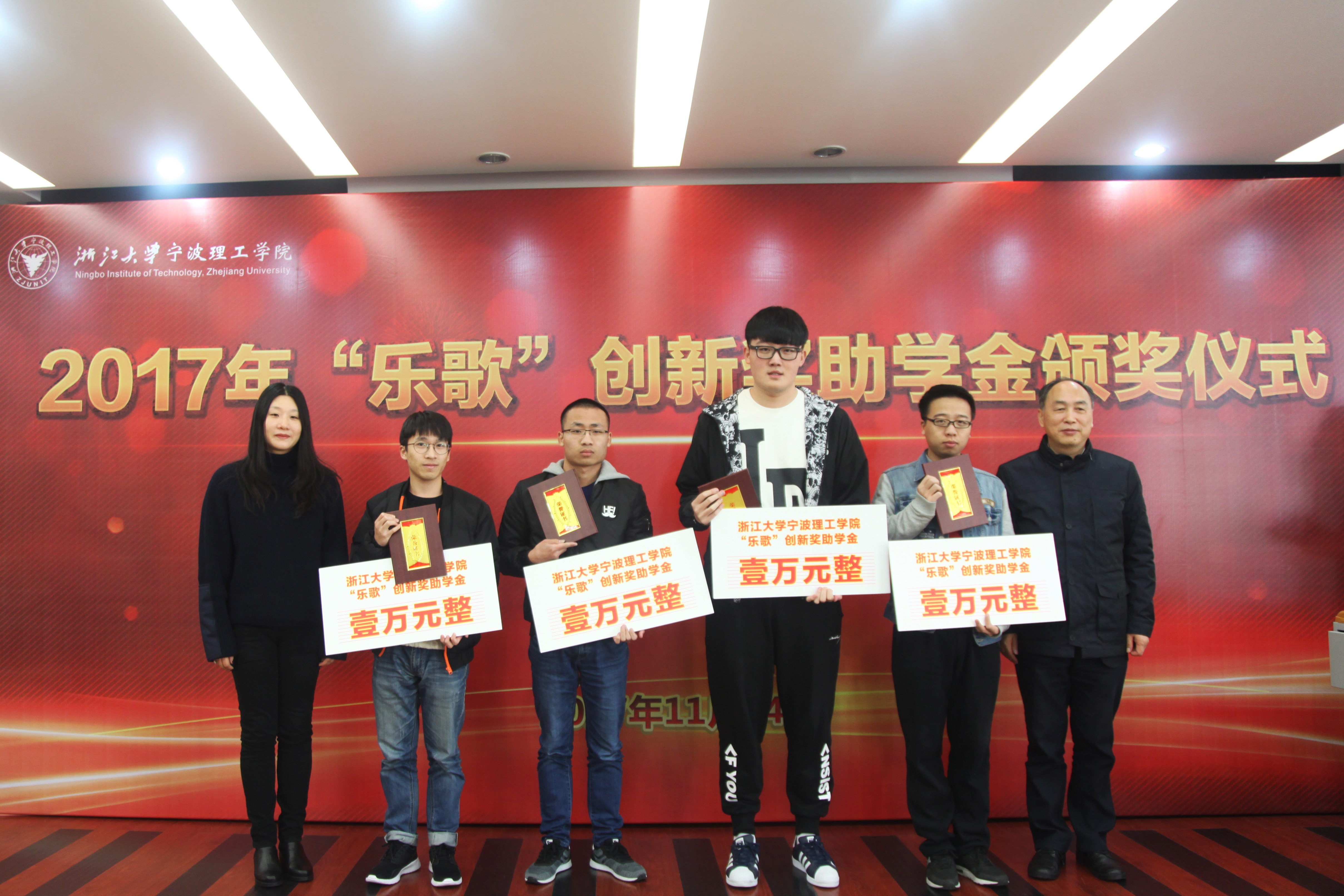陈立明部长在主持仪式时对“乐歌”创新奖助学金的设立背景和近几年评选工作做了简要介绍;黄光杰副书记宣读了《浙江大学宁波理工学院2017年“乐歌”创新奖助学金获得者名单》;出席仪式的来宾、领导共同为奖助学金获得者颁奖;机能学院党总支书记吴春、一等奖获得者传媒学院虞家伟同学作为代表发言,向乐歌人体工学科技股份有限公司关心学生成长发展,慷慨捐助激励学子奋进求学的情怀与行动表达了诚挚的感谢。