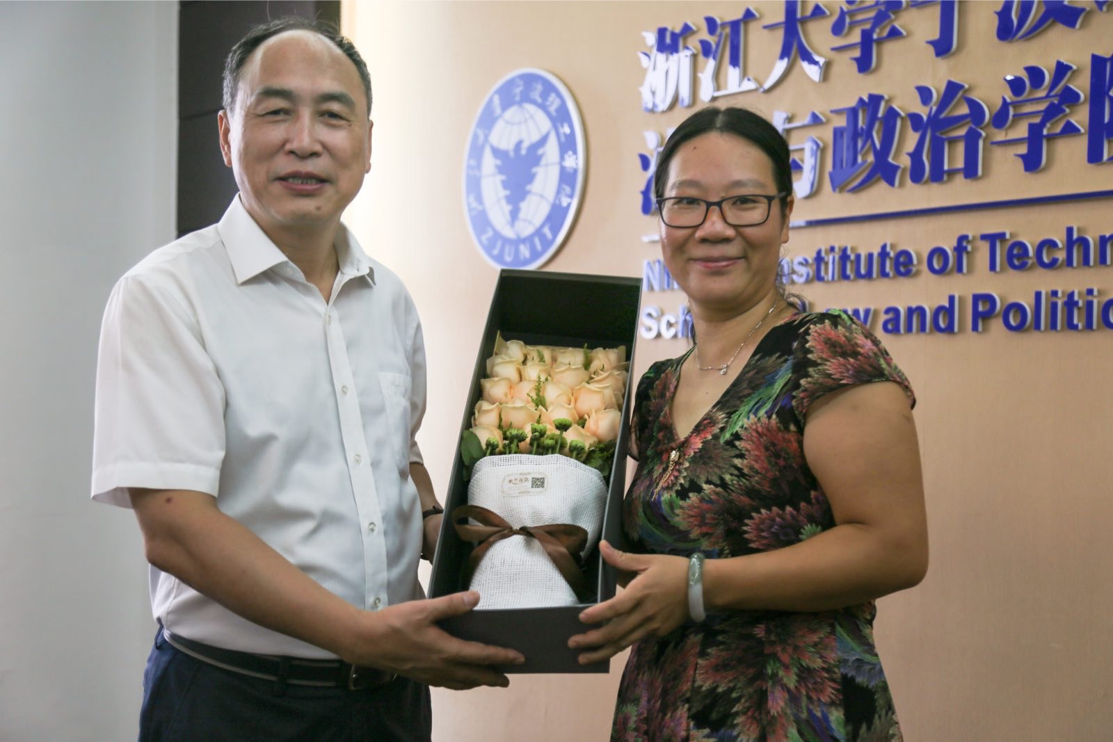 党委书记费英勤首先来到生化学院,祝贺沈昊宇老师获得“浙江省第五届师德标兵”荣誉称号。接着来到法政学院,向今年国家社科基金获得者朱美燕老师表示祝贺。同时,他还寄语思政部教师,希望教师们多出特色成果。