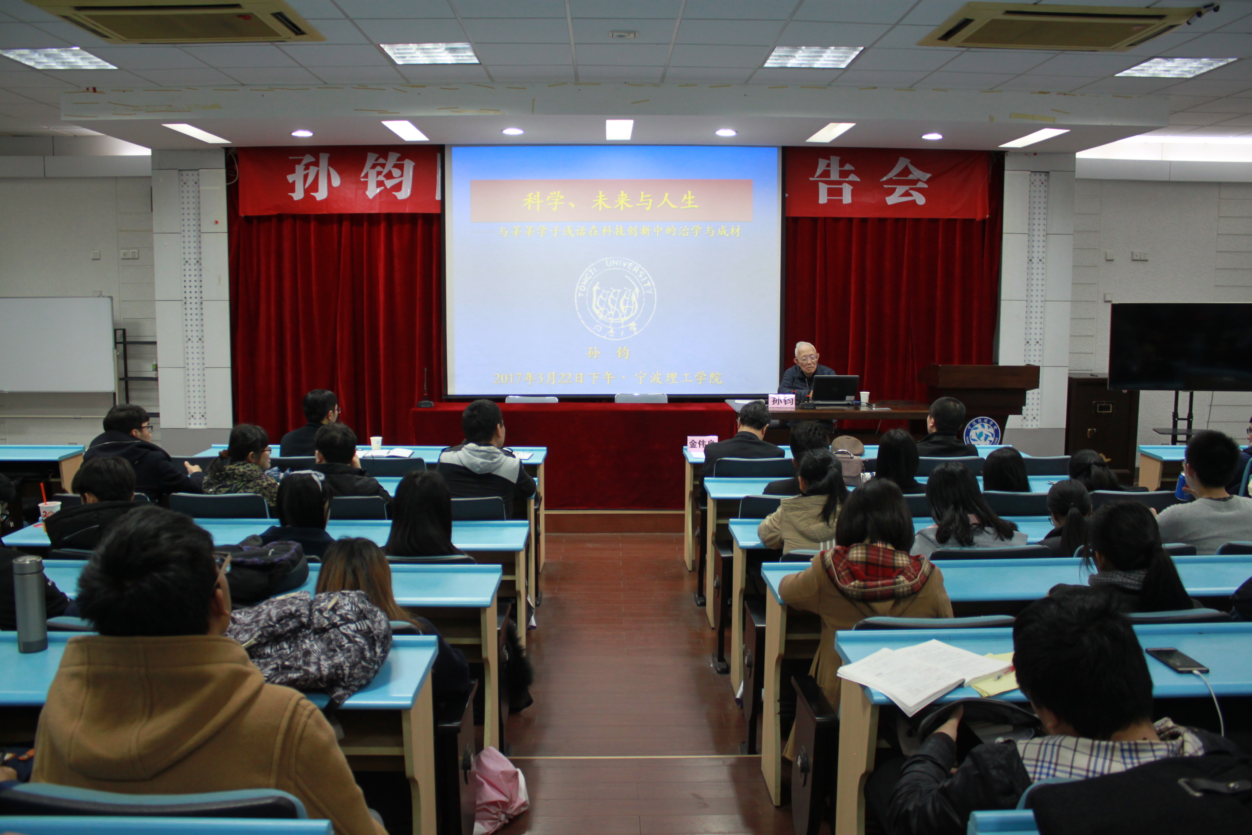 会上,孙钧院士为师生们作了题目为《科学·未来·人生——与莘莘学子浅话在科技创新驱动中的治学与成才》的学术报告。孙院士结合亲身治学和科研经历,从人生追求、成才之路、治学方法、责任奉献四方面分享了他的看法和感受,给了广大师生们许多启迪。
