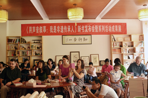 随后,传承人代表陈祥源、教师代表李飒、学生代表舒华三方揭幕、合影,并举行了新书赠书仪式。仪式后,余姚莲花文书传承人卢后和老师带来的《刘玉英借花银》赢得了满堂喝彩,到场的两位外教也赞不绝口。