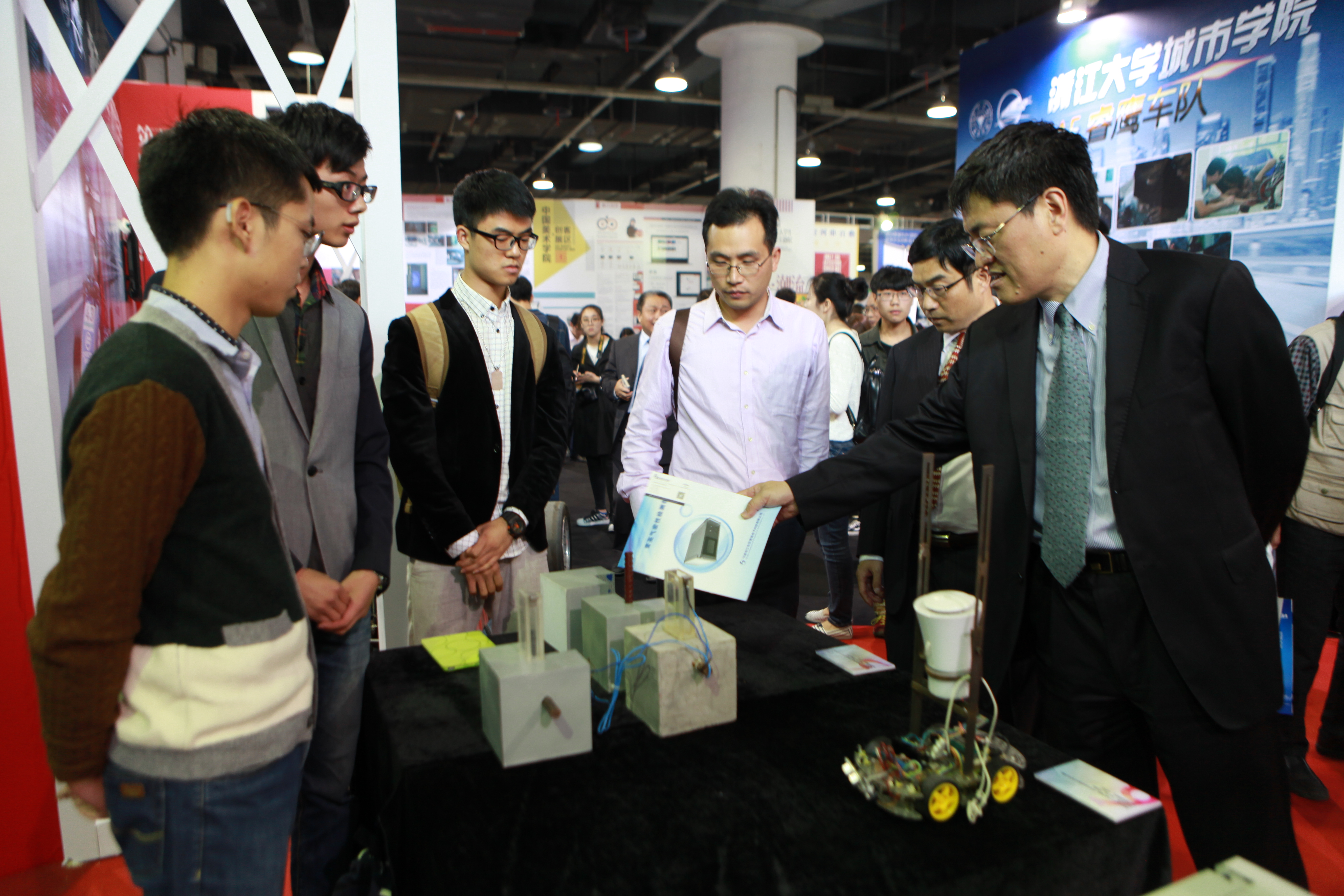 在创客校园展区,开云展位上几台科技含量较高的作品吸引着不少人驻足参观。一种可遥控、可自动巡逻并可按指定路线运行的空气净化装置。针对沿海腐蚀环境下工程结构研发的无损检测传感器等,吸引了不少企业家询问,并表示希望有机会合作。期间,大创节组委会主任、浙江大学党委副书记任少波等领导还亲临开云展位参观,并对开云作品和创意创新创业教育给予了充分肯定。