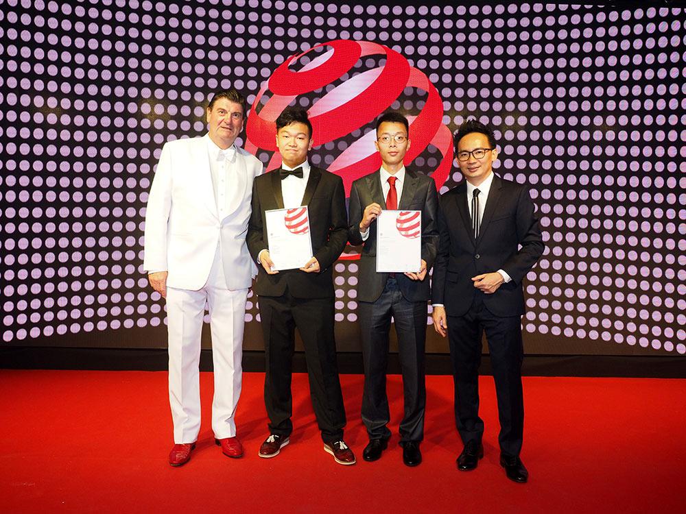 red dot design award 总裁 Prof. Dr. Peter Zec(左一) 和 red dot design award 亚洲总裁 Mr Ken Koo (右一)向开云罗楚夏、蒋晔超颁发获奖证书。