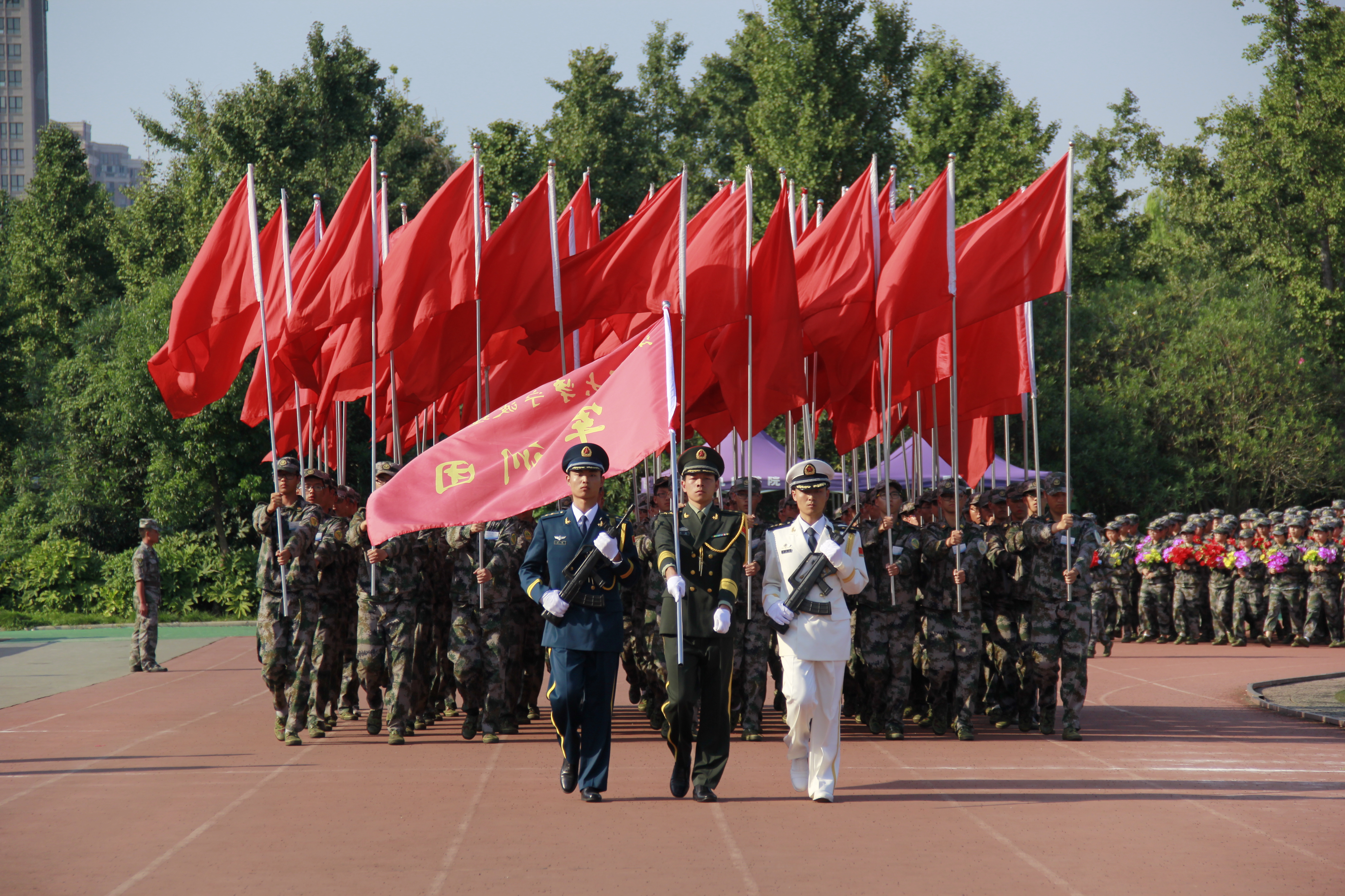在庄严的国歌声中,大会拉开了帷幕。阅兵式上,在军训团政委黄光杰和军训团团长谢正强的陪同下,浙江大学军训师政委严建华检阅了部队。24个连队,2700多名参训学员以矫健的步伐和昂扬的精神风貌接受了检阅,交上了一份令人满意的答卷。除了气势十足的方阵展示,表演科目中的团体操、军体拳、战术表演也令人眼前一亮,引来阵阵掌声。