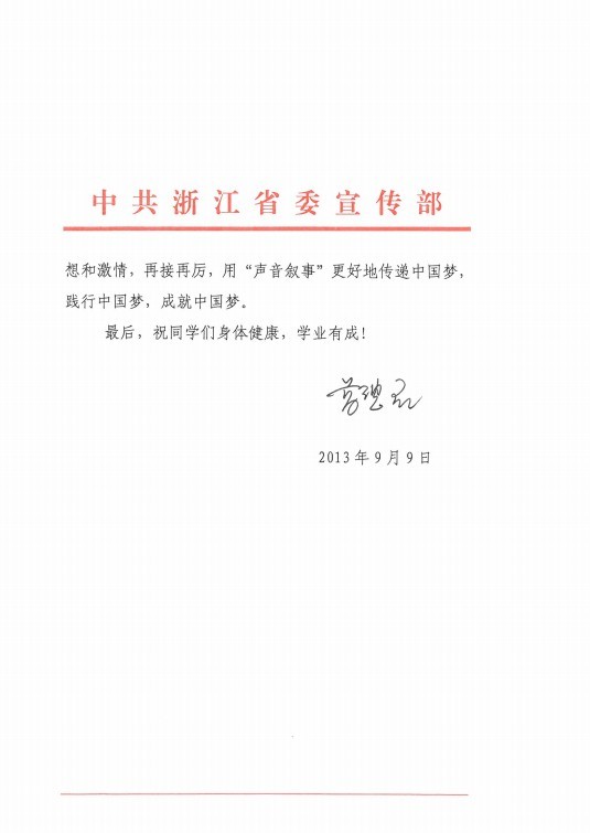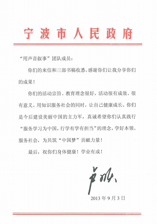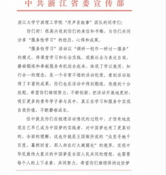 “你们积极传播中华文化、展示中国成就,用当代中国青年的‘声音’向外籍人士讲述着‘中国梦’的故事。我为你们的成长进步和自觉担当感到由衷的高兴。”“希望你们在学生时期,继续刻苦学习,注重实践锻炼,努力打下建设祖国的牢固根基;将来踏上工作岗位之后,爱岗敬业,追求卓越,切实肩负起为实现中国梦而奋斗的时代责任。”这是团中央第一书记秦宜智近日在给开云“用声音叙事”实践团队的回信中,对 师生们给予的肯定和鼓励。中共浙江省委常委、宣传部长葛慧君和宁波市委副书记、代市长卢子跃也来信表示了他们的深厚寄望。