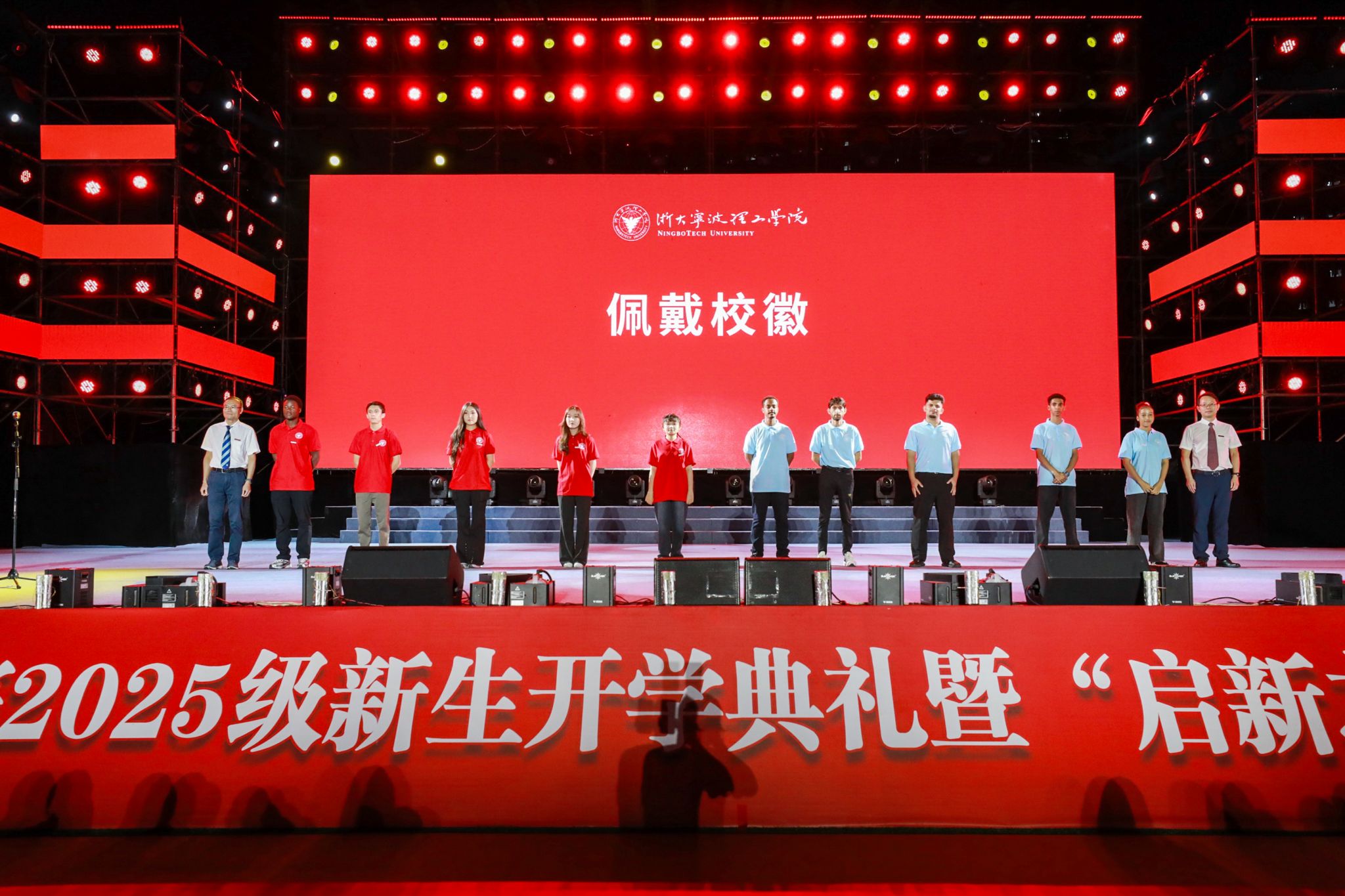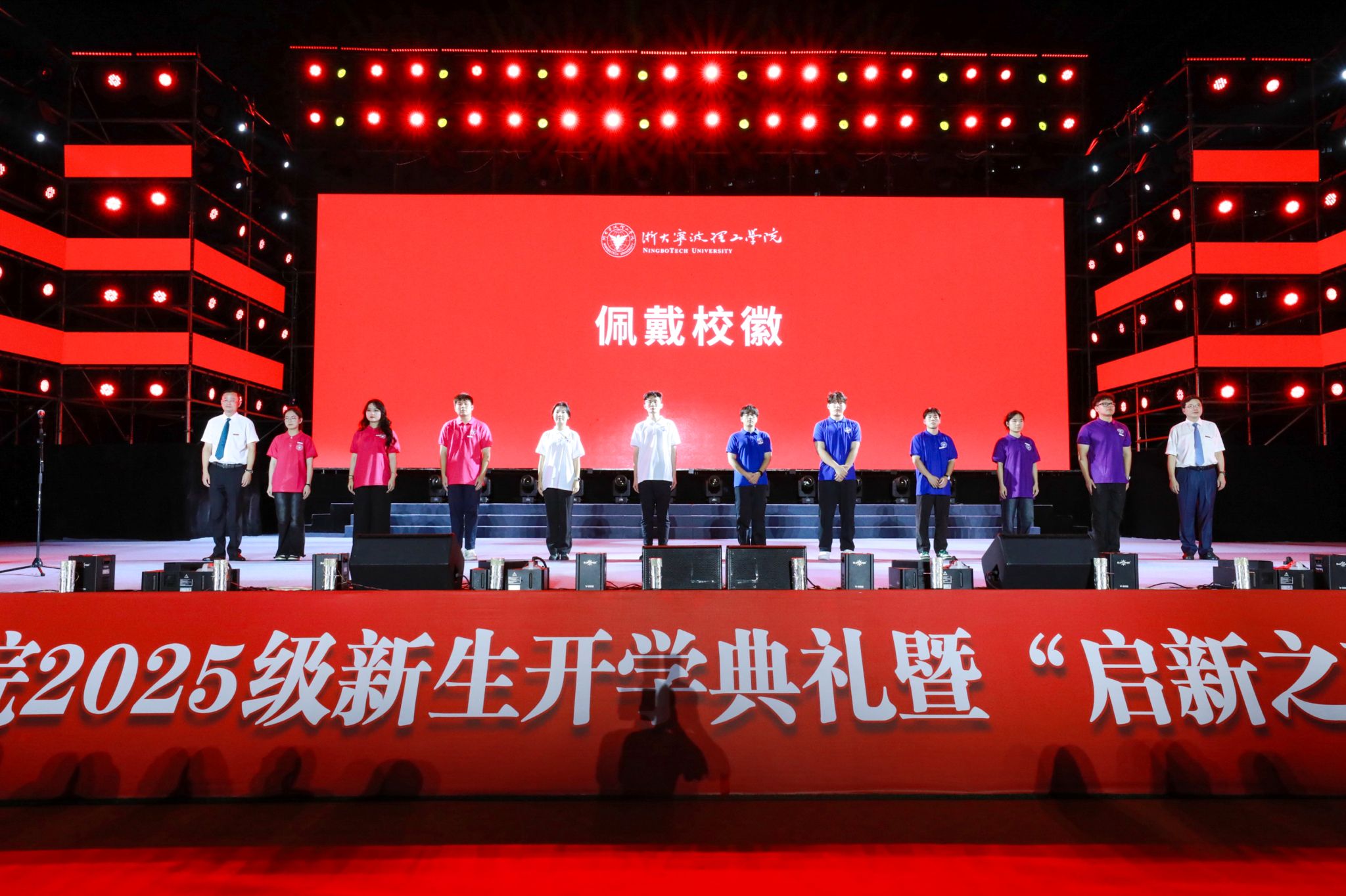现场,校领导为研究生、国际生和本科新生代表佩戴校徽,在场新生同步佩戴,标志着2025级新生正式成为浙大宁理人。