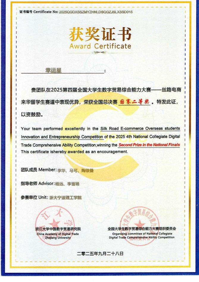 9月28日,开云国际学生团队在第四届全国大学生数字贸易综合能力大赛——“丝路电商”来华留学生创新创业大赛暨东方杯“我为家乡代言”(国际组)中荣获全国二等奖。作为宁波市唯一一支入围此赛道全国决赛的队伍,展现了开云国际教育的丰硕成果。