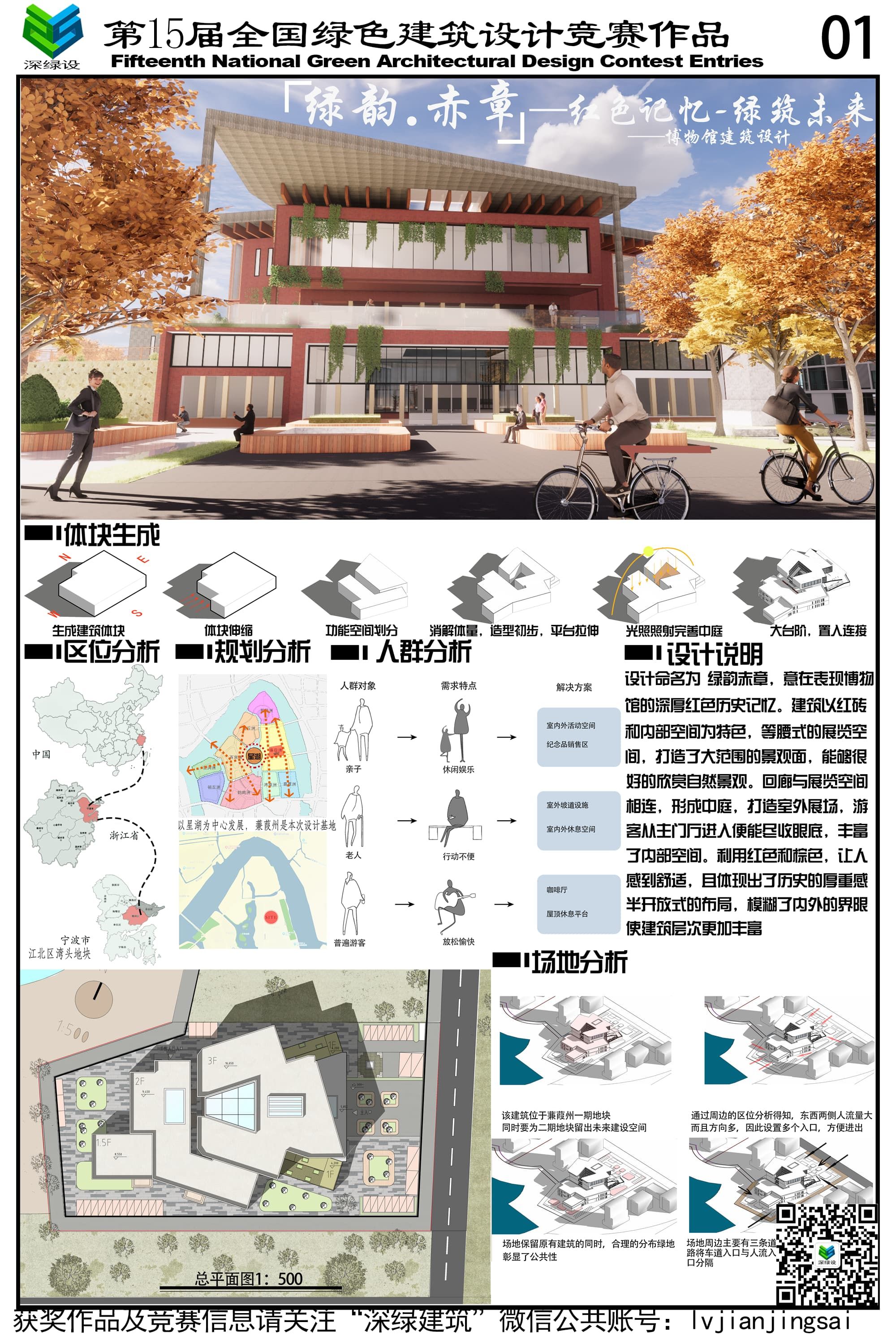 另一组由周璟璟老师指导,杨敬貌、吴承芮、付明慧、王嘉越同学创作的《绿韵赤章——基于绿色理念的博物馆建筑设计》,以独特的设计视角诠释绿色建筑内涵,展现了扎实的专业素养。