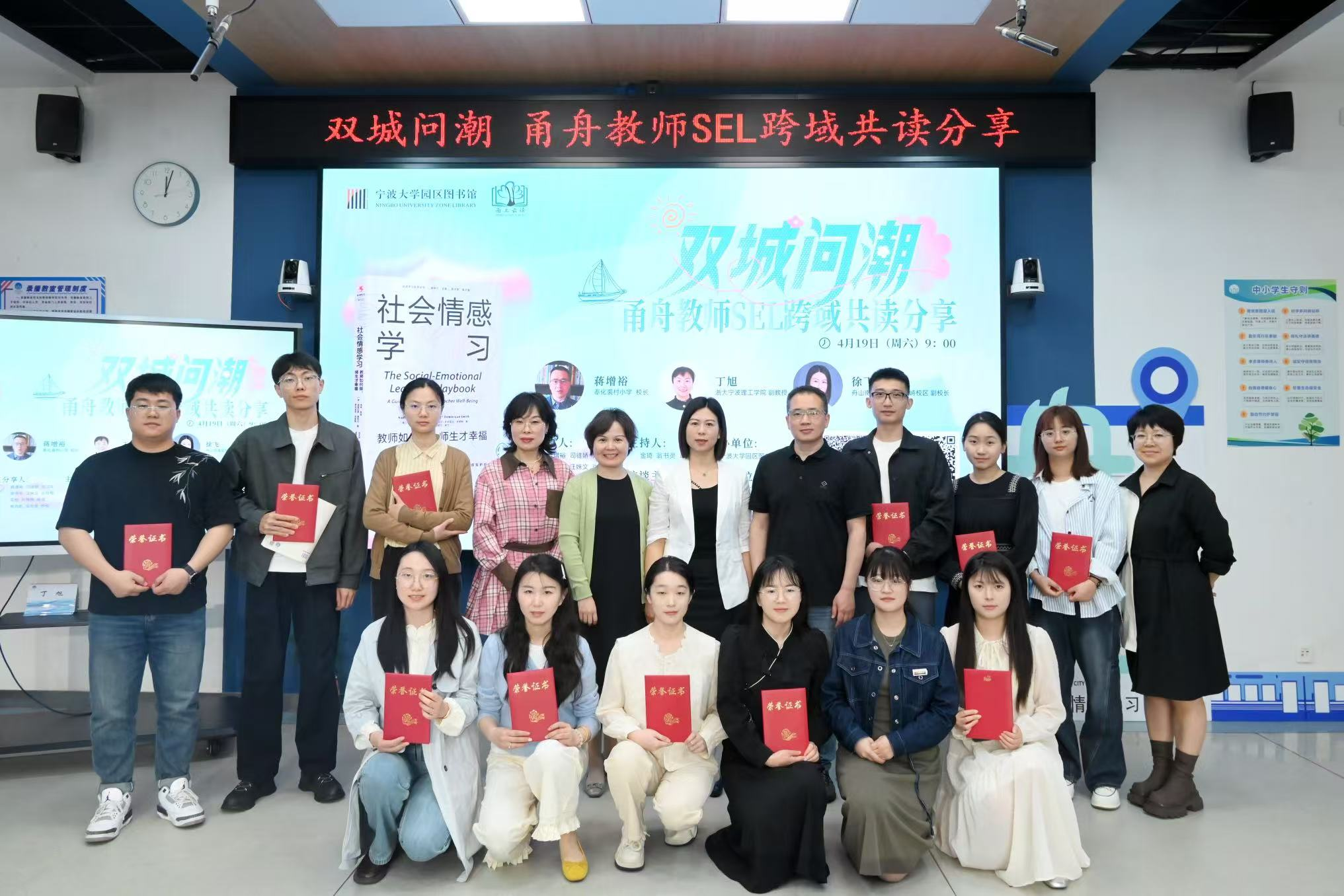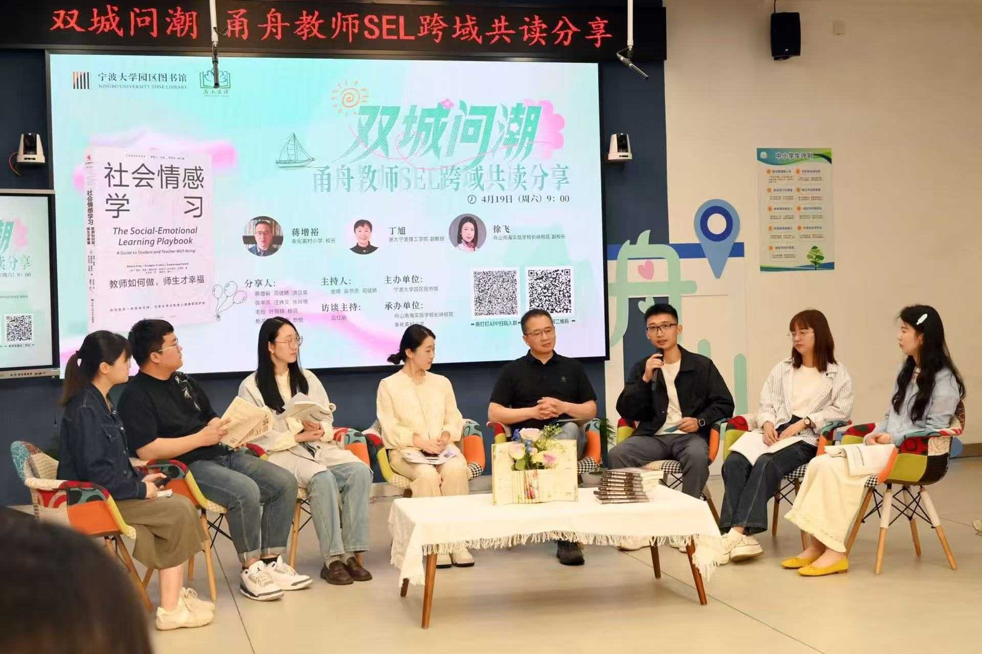 4月19日上午,“双城问潮:甬舟教师SEL共读探索”跨域教师共读活动在舟山市南海实验学校长峙校区举行。这是宁波大学园区图书馆“甬上云读”教师专业阅读推广项目,今年开展的第二期共读分享活动。
