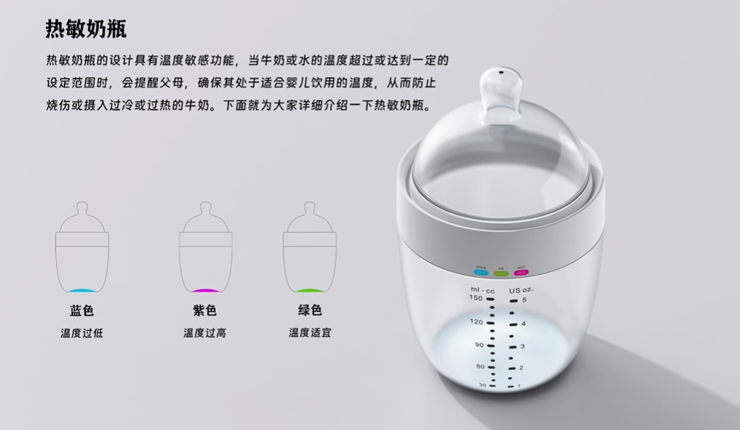 热敏型婴儿奶瓶是一款能够智能感应温度、直观显示水温结果的婴儿奶瓶,跳过了冲奶器、热奶器等使用流程,通过奶瓶本身解决了温奶的问题,进一步优化奶瓶的使用流程提高了操作效率,以帮助新手父母更轻松、准确地掌握奶瓶内的温度情况。这不仅降低了新手父母的学习成本,还为宝宝的健康成长提供了更加贴心、细致的呵护。设计者也希望通过这款产品,推动婴儿用品行业的创新发展,为更多家庭带来便利和幸福。