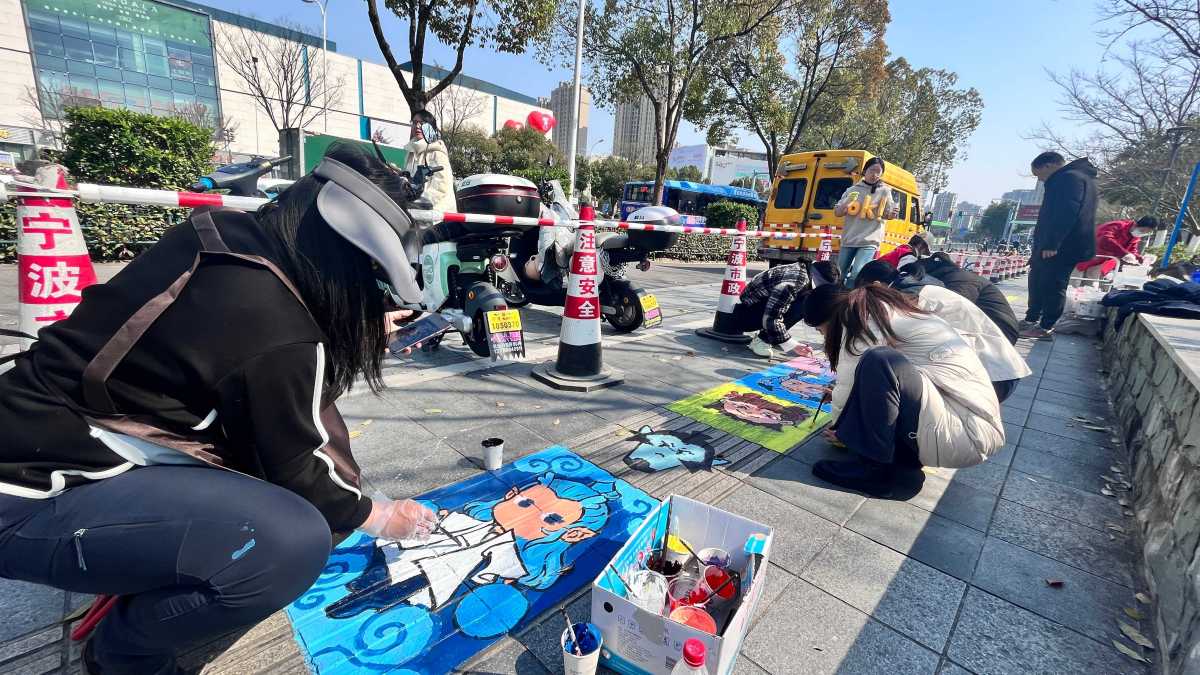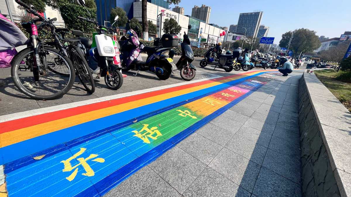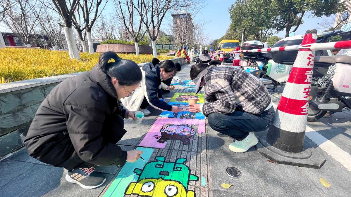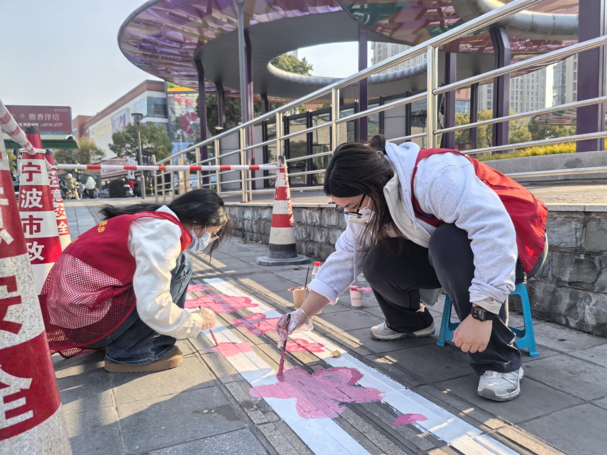 鄞州区志愿者将地铁站附近盲道涂鸦成七彩路,为特殊群体出行增添温暖活力。