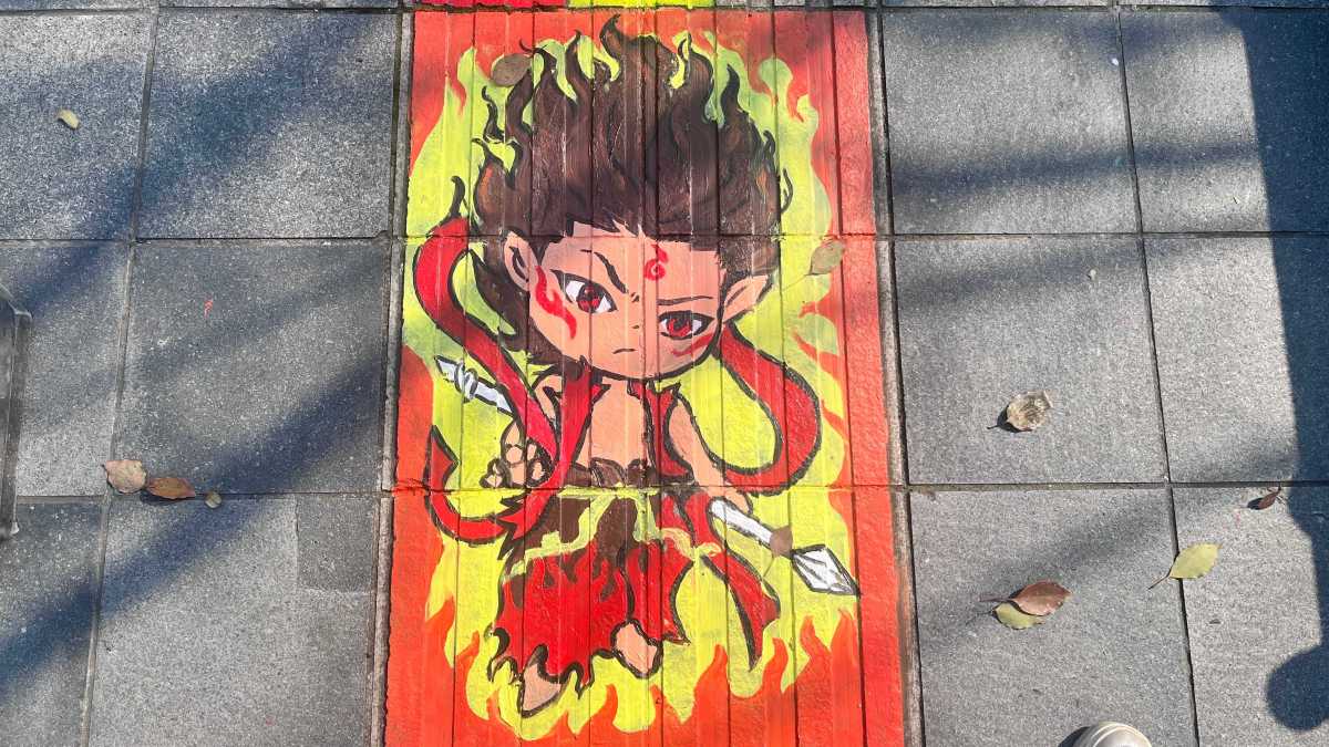 活动现场,来自桑菊社区的志愿者薛凤燕正手持调色盘进行调色,开云kaiyun官网的志愿者们蹲在盲道上勾勒彩虹,金城社区的绘画达人练丹妮则用画笔描绘出今年最火的国产动画电影《哪吒2》中的系列人物。