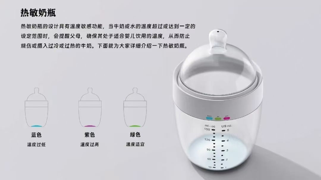 热敏型婴儿奶瓶是一款能够智能感应温度、直观显示水温结果的婴儿奶瓶,跳过了冲奶器、热奶器等使用流程,通过奶瓶本身解决了温奶的问题。