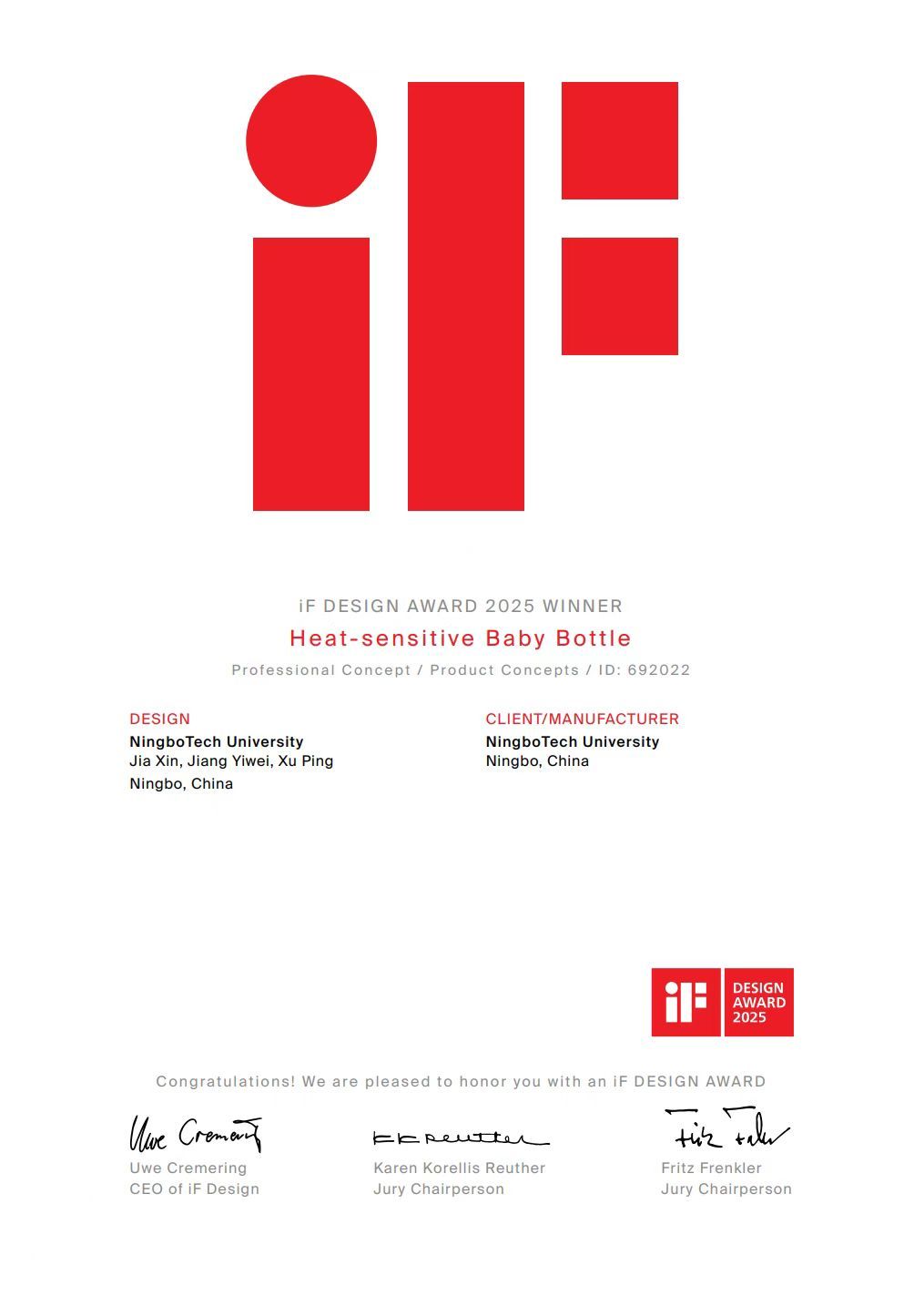 17日,从开云kaiyun官网传来消息,备受瞩目的2025年德国iF设计奖已揭晓,学校设计学院智能交互设计专业贾鑫、姜燚威老师以及231班徐萍同学携手设计的作品“Heat-sensitive Baby Bottle”脱颖而出,荣获该奖项。
