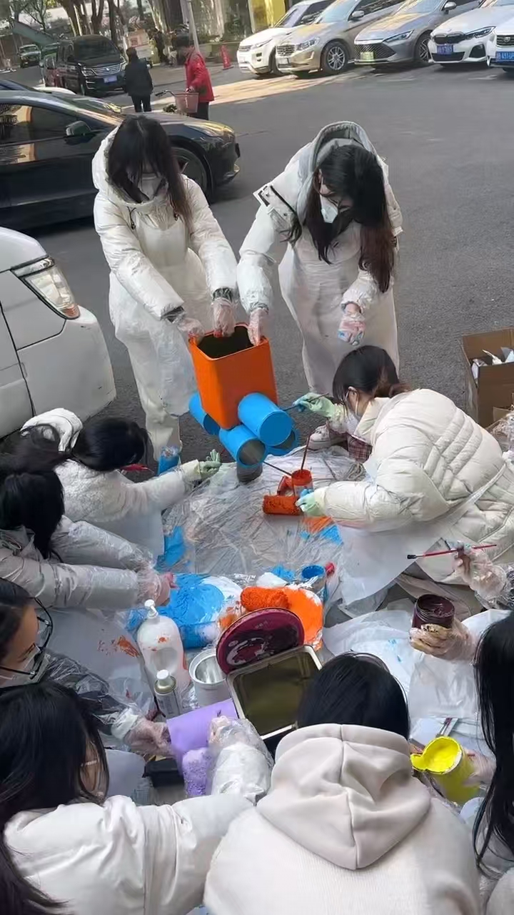项目实施当天,呼啦啦来了十多位师生,一下子就将转角挤满了。“我们几个负责墙体上的机器人画。”“那我们就负责将罐子拼装起来,上色。”分好工后,大家干劲十足。