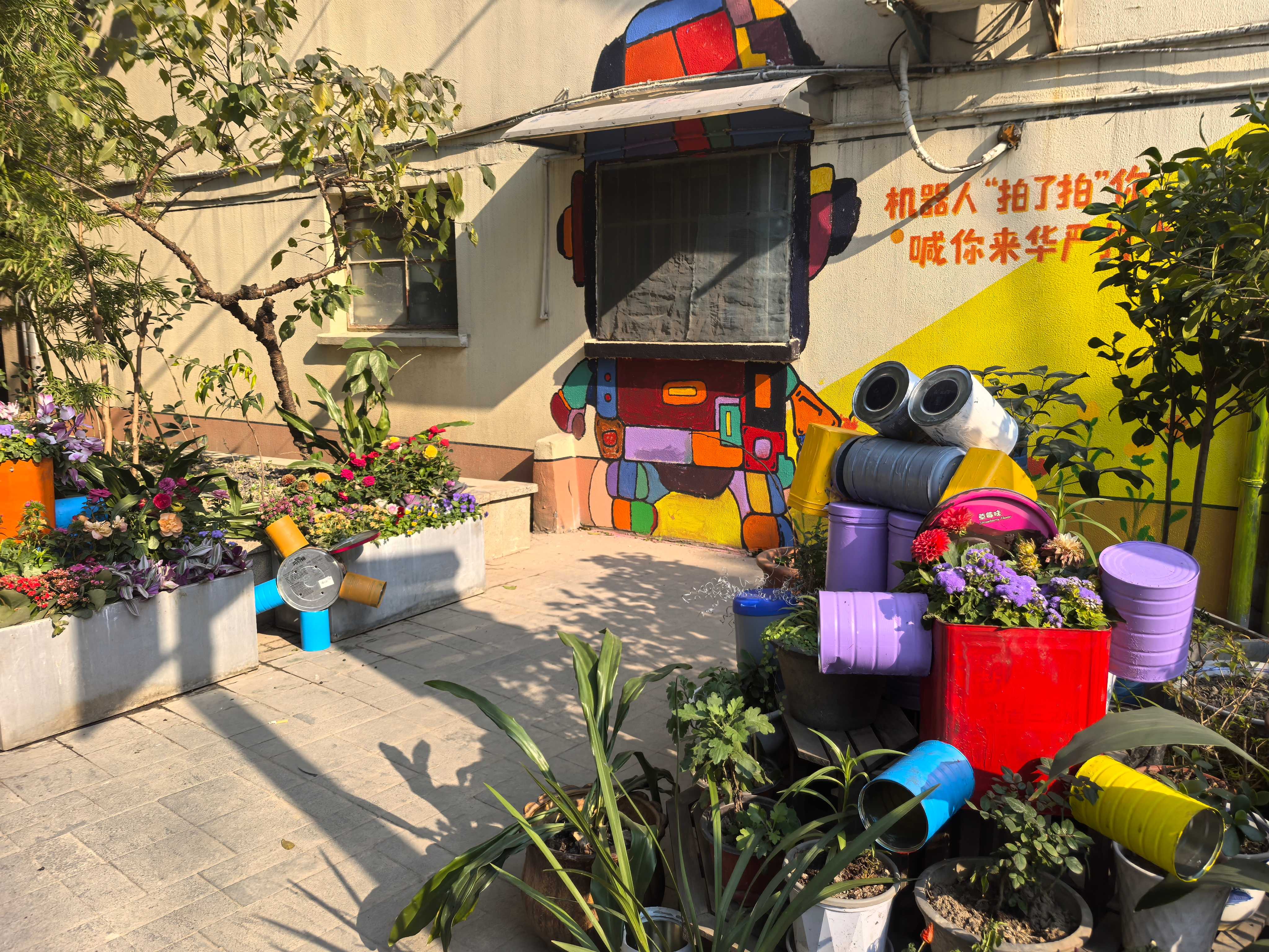 花园面积不大但着实抢眼,不起眼的废弃瓶瓶罐罐,经过“打扮”后成了小花园的装置点缀和种花容器,马卡龙色系的“机器人”充满童趣和科技感,让路过的市民不经意间就“撞见”了未来。