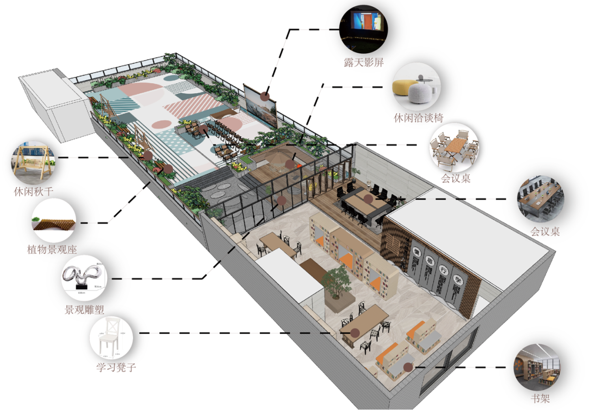 露天影院、休闲秋千、景观雕塑、休闲椅……朱佳怡小组计划将屋顶花园打造成一个多功能的休闲运动空间,取名“乐活天地”,希望能成为社区的网红打卡点。