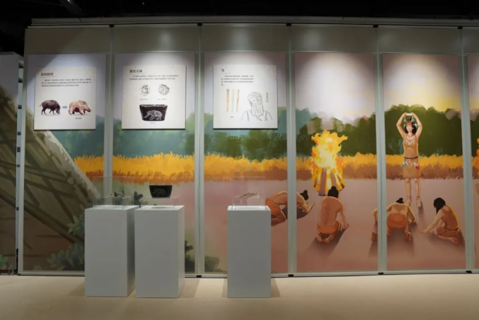 此次展览以大型绘画为背景,展示河姆渡先民渔猎荒泽、干栏建筑、稻作农业、纺织缝纫、炊煮器具、原始艺术6个生产生活场景,并辅以25组59件河姆渡文化各遗址典型器物的复制品,让公众可以用触摸的方式走近河姆渡文化。