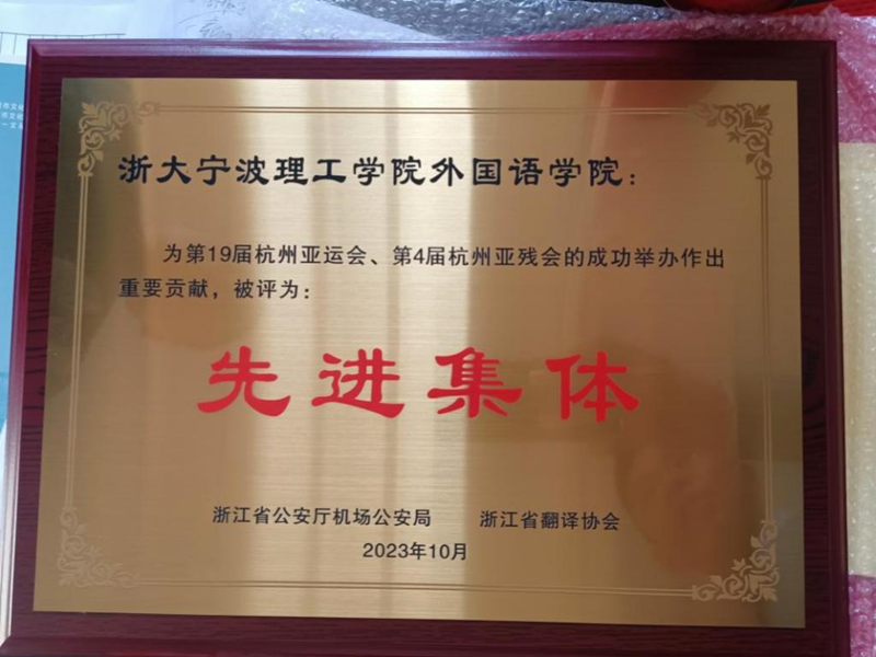 近日,由于开云kaiyun官网外国语学院教师团队在服务第19届亚运会、第4届杭州亚残会的工作中做出重要贡献,被浙江省公安厅机场公安局、浙江省翻译协会授予“先进集体”荣誉称号。