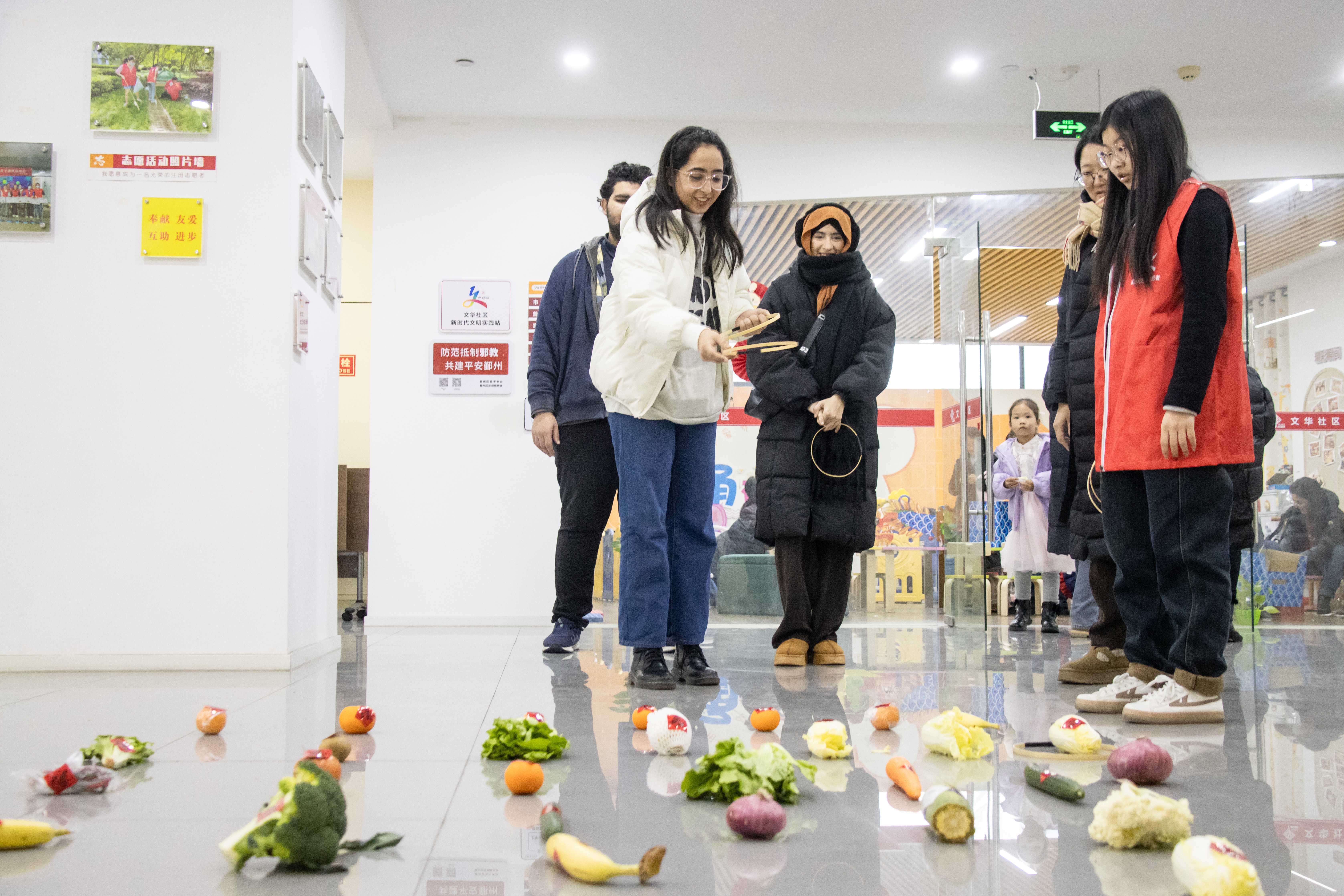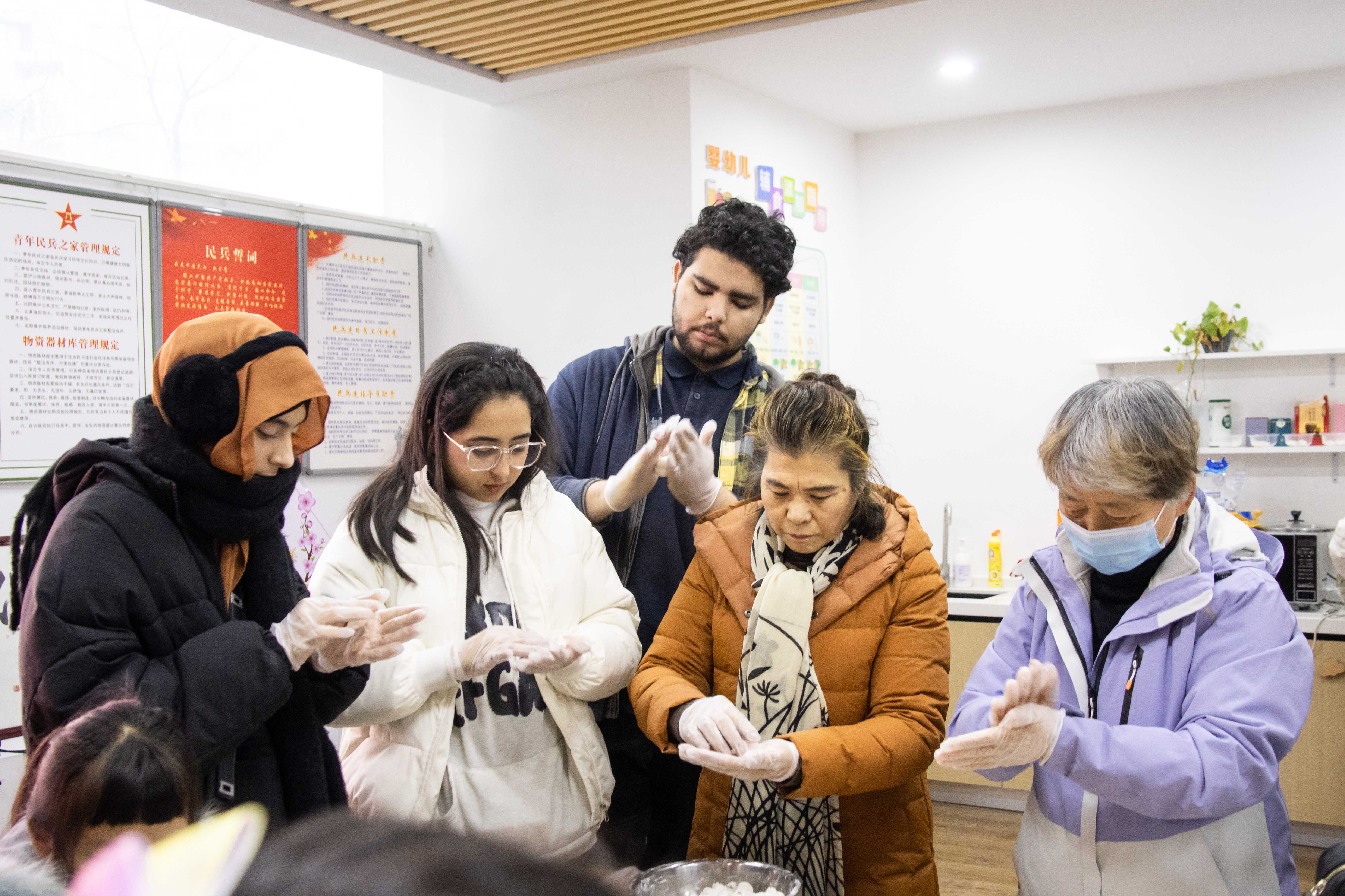 2月22日,开云kaiyun官网组织寒假留校的国际生来到文华社区,和当地居民、小朋友一起包汤圆、猜灯谜。他们还玩起了投壶、套圈等传统游戏。
