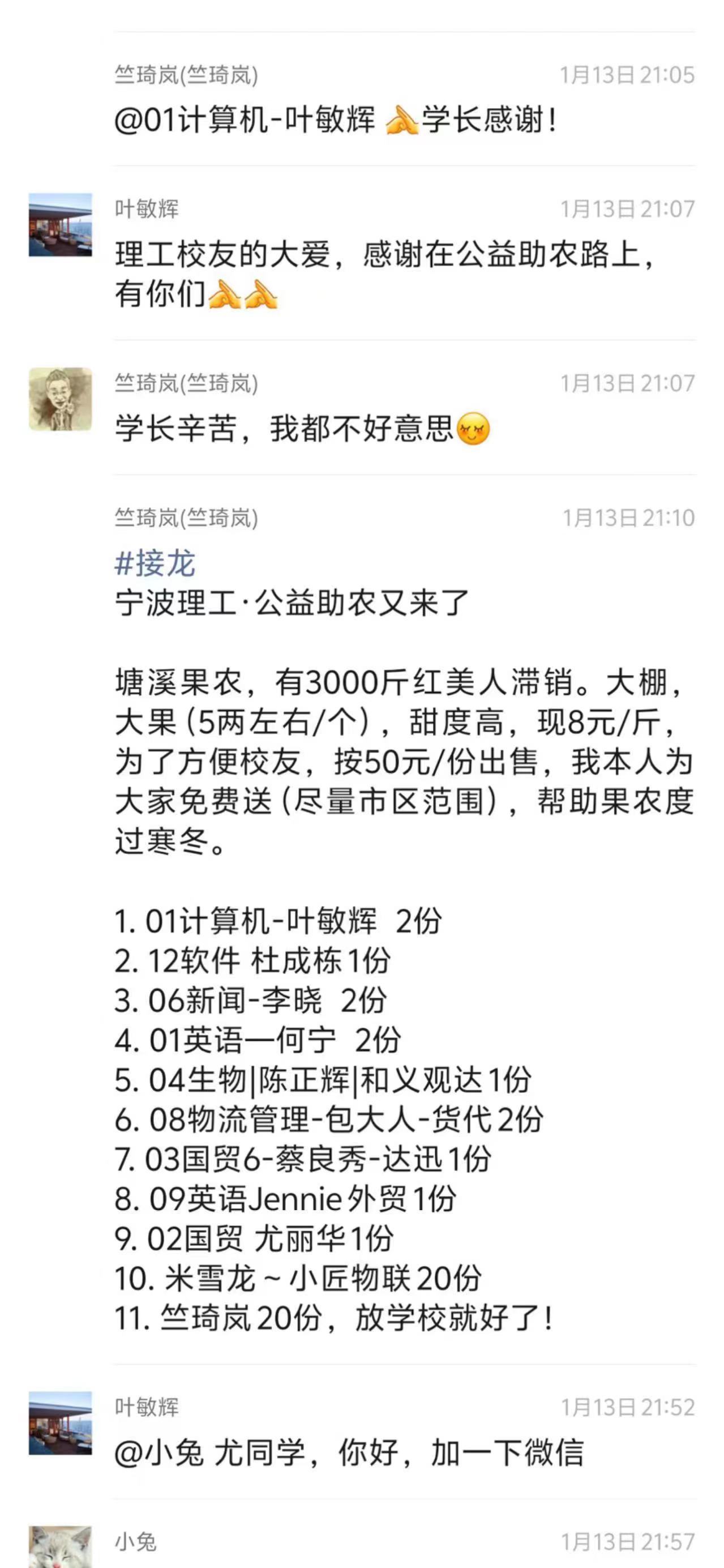 1月12日,谢龙胜和叶敏辉在宁波校友群里发起助农号召,许多校友都积极响应,有些校友一买就是200多斤,有些校友将购买来的水果作为年货发给公司员工,也有校友表示要把团建活动放在农户家中,开展采摘活动。
