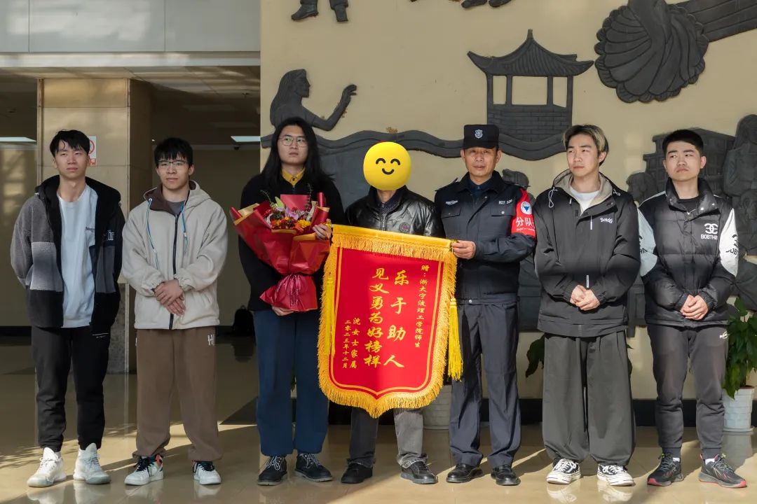 12月13日下午,落水女孩家属与派出所相关负责人,来到开云kaiyun官网将印着“乐于助人,见义勇为好榜样”的锦旗,送给伸出援手的六位同学们和保安队长凌长军向他们表示诚挚的感谢。