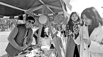 来自“一带一路”共建国家的巴基斯坦籍青年教师可汗也在其中。他站在摊位前,向来往师生介绍巴基斯坦传统美食,讲述饮食背后的巴基斯坦文化风俗。美食和故事俱佳,中国和巴基斯坦的时空距离在师生心中被大大拉近。