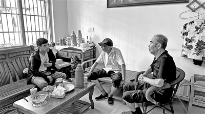 可汗(左一)与浙江宁波鞍山村民间艺术家交流。李凯然 摄