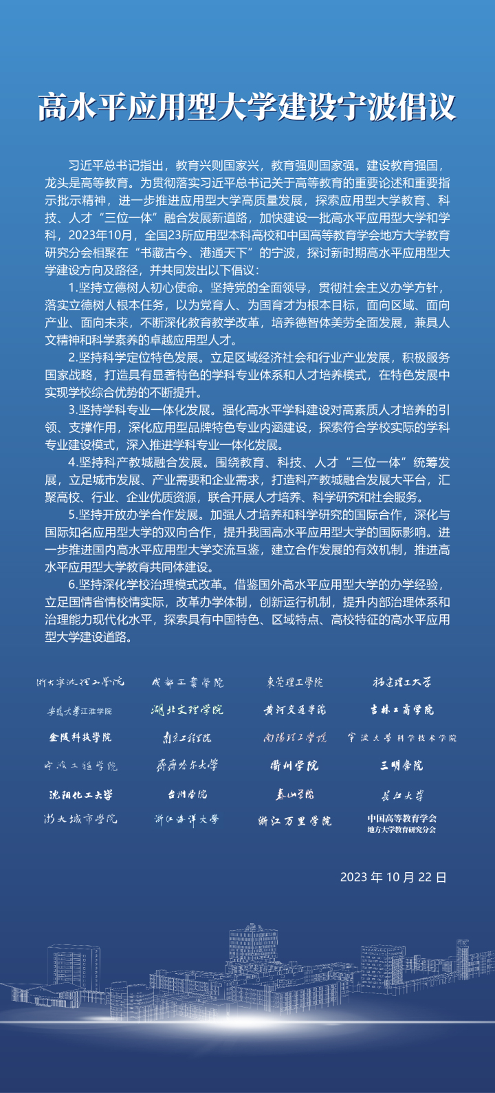 会议同步发布了《高水平应用型大学建设宁波倡议》。高水平应用型大学建设宁波倡议是由23所应用型本科高校和中国高等教育学会地方大学教育研究分会共同发出,共24个单位。本次倡议提出:“坚持立德树人初心使命、坚持科学定位特色发展、坚持学科专业一体化发展、坚持科产教城融合发展、坚持开放办学合作发展、坚持深化学校治理模式改革。”